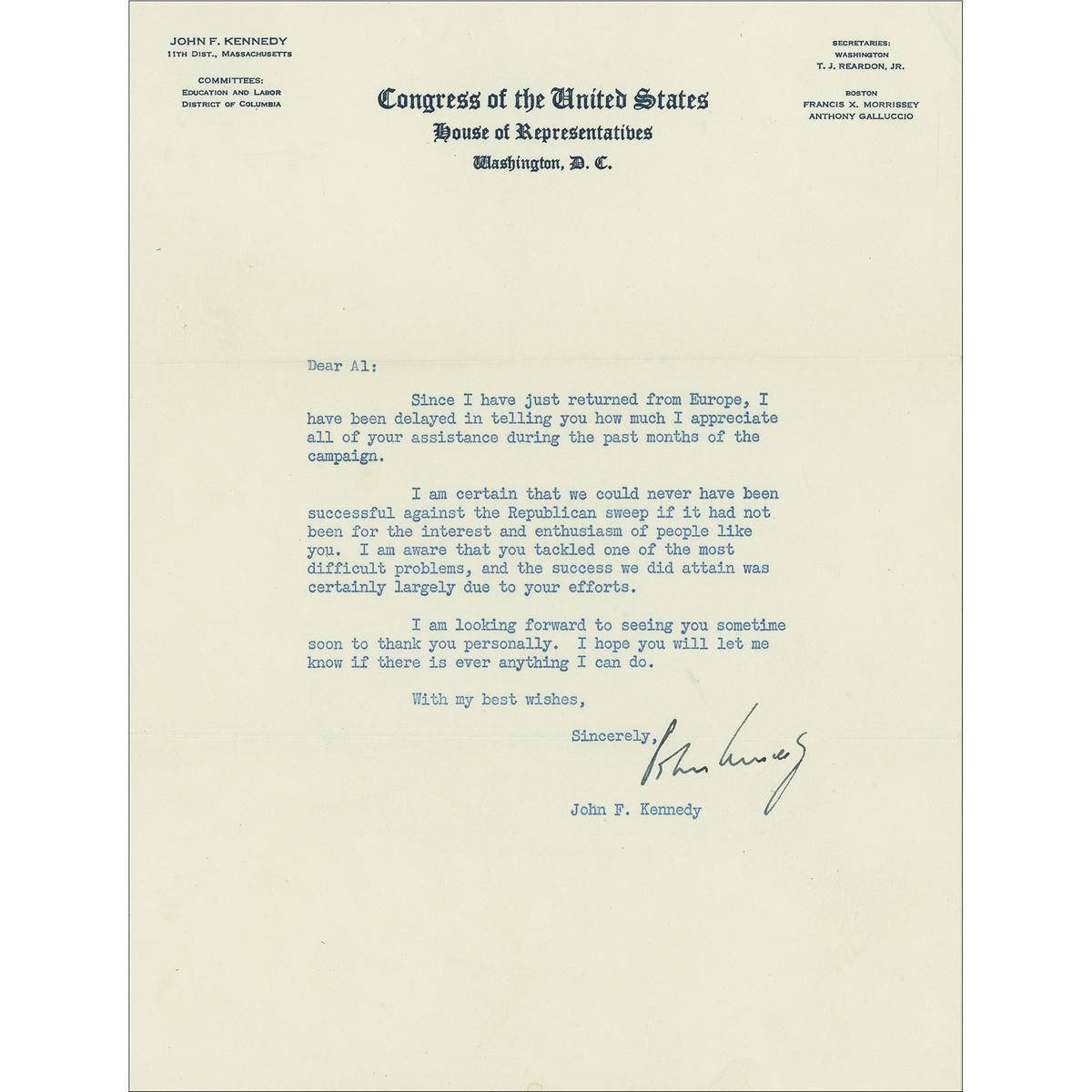 TLS, one page, 8 x 10.5, Congress of the United States, House of Representatives letterhead, no date. Kennedy sends thanks to a supporter. In part: “Since I have just returned from Europe, I have been delayed in telling you how much I appreciate all of your assistance during the past months of the campaign. I am certain that we could never have been successful against the Republican sweep if it had not been for the interest and enthusiasm of people like you. I am aware that you tackled one of the most difficult problems, and the success we did attain was certainly largely due to your efforts.” Horizontal fold lightly affecting tops of a few letters of signature, a few creases, and a mild central vertical fold, otherwise fine condition.