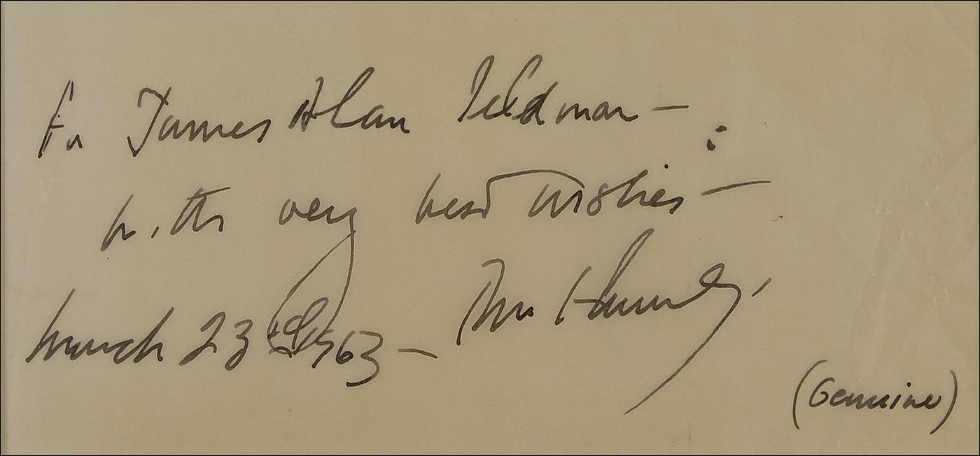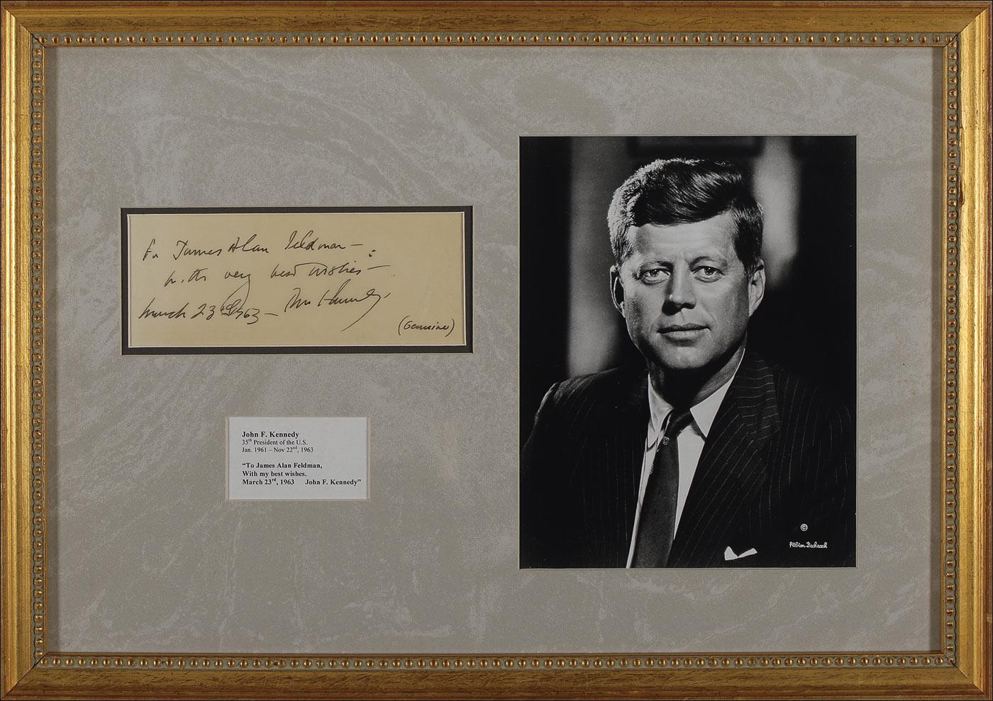 Vintage fountain pen signature and inscription, as president, “For James Alan Feldman—With very best wishes—John F. Kennedy, March 23, 1963,” on an off-white 7 x 2.75 slip. Double matted and framed with a portrait of Kennedy and a small caption, to an overall size of 21 x 15. In fine condition, with a uniform shade of light toning and some creasing to right side, not affecting signature.