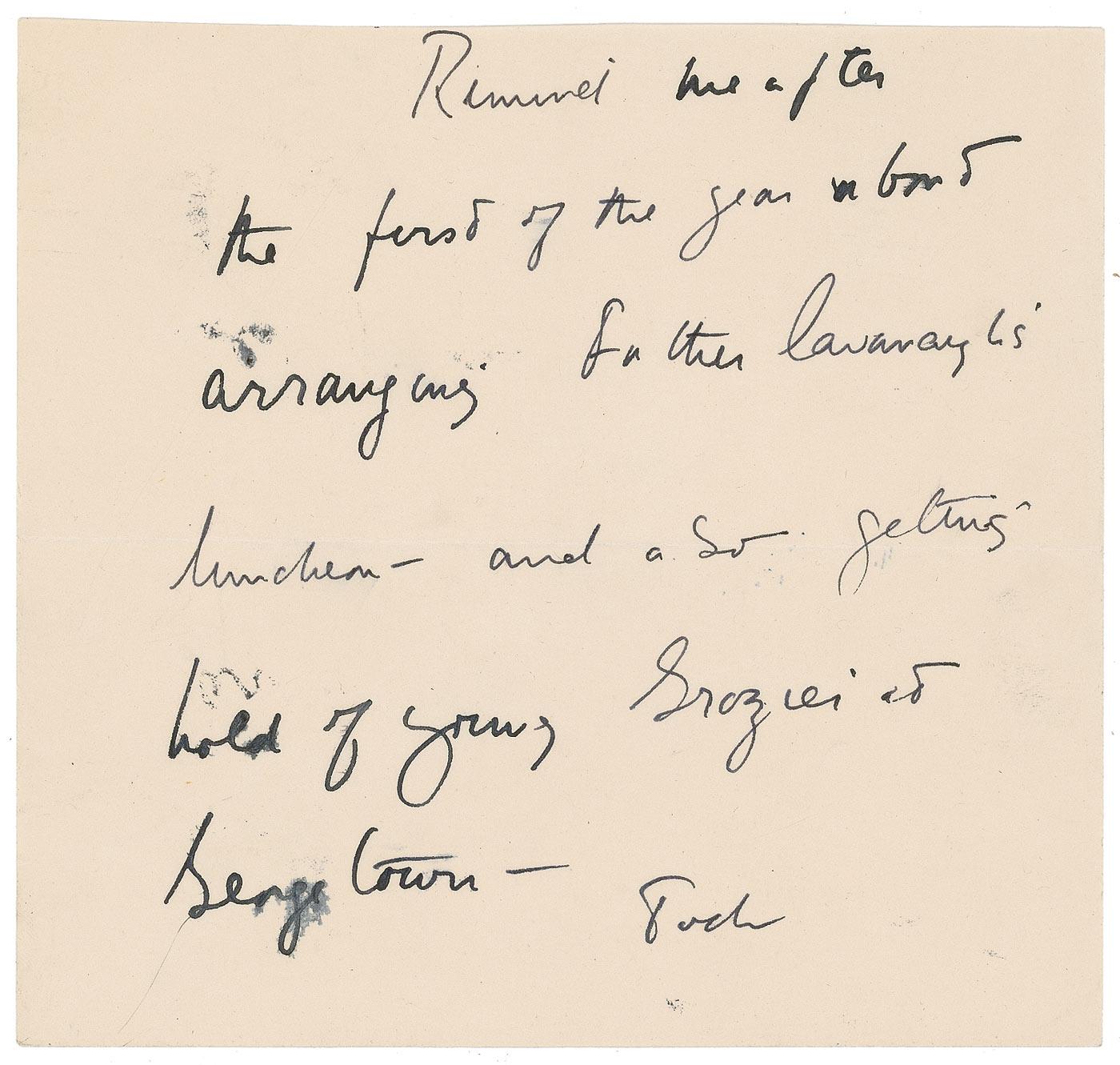 ANS signed “Jack,” one page, 6.25 x 6, no date. Short note to Dave Powers reminding him to schedule events after the first of the year. In full: “Remind me after the first of the year about arranging Father Cavanaugh’s luncheon — and also getting hold of young Grozier at Georgetown.” In fine condition, with lightly trimmed edges, and a horizontal fold resulting in a bit of light smudging to a couple words of text. Father Cavanaugh was the personal priest of the Kennedy family and a long-time friend of Joe Kennedy. He led a private Mass for the Kennedy family Saturday, November 23, 1963, after the shocking assassination of President John F. Kennedy a day earlier.