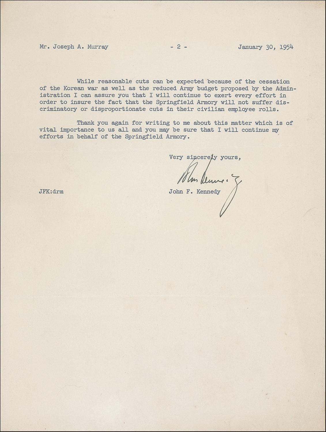 Second page of a TLS, 8 x 10.5, January 30, 1954. As US senator, Kennedy writes Joseph A. Murray regarding employment cuts at the Springfield Armory in Massachusetts. In full: “While reasonable cuts can be expected because of the cessation of the Korean war as well as the reduced Army budget proposed by the Administration I can assure you that I will continue to exert every effort in order to insure the fact that Springfield Armory will not suffer discriminatory or disproportionate cuts in their civilian employee rolls. Thank you again for writing to me about this matter which is of vital importance to us all and you may be sure that I will continue my efforts in behalf of the Springfield Armory.” In fine condition, with mailing folds, creasing along right edge, a slight crease at the lower right corner, and faint edge toning. Established by General George Washington early in the Revolutionary War, Springfield Armory began making muskets in 1794 and soon perfected manufacturing methods that became critical to the industrialization of the United States. As JFK notes here, the cease-fire in Korea six months earlier reduced the heavy need for military weaponry and threatened employment at the facility. Interesting, although the newly married Massachusetts senator emphatically touted the economic interests of the Bay State, at the same time he was faced with providing for the national good via proposed construction of the St. Lawrence Seway—a measure that negatively impacted New England harbor traffic. Eventually voting in favor of the seaway, Kennedy was ultimately unsuccessful in keeping the armory from suffering the aftereffects of the war.