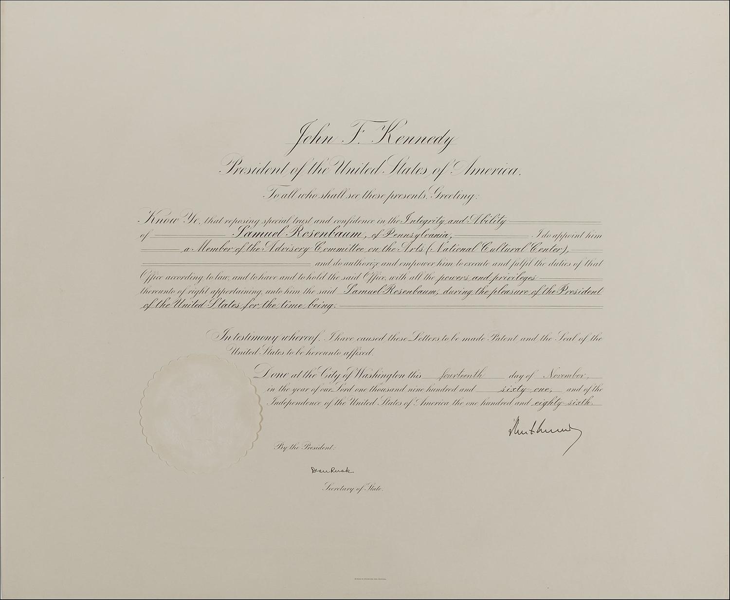 Outstanding partly-engraved DS as president, boldly signed “John F. Kennedy” and counter-signed by Secretary of State Dean Rusk, one page, 22.5 x 18.75, November 14, 1961. An appointment for Samuel Rosenbaum as a member of the Advisory Committee on the Arts (National Cultural Center). Faint toning to extreme edges and slight wrinkling to the edges, otherwise fine, clean condition. The lightly-toned embossed paper seal remains intact at lower left. Rosenbaum was a leading Philadelphia attorney who served as a Philadelphia Orchestra trustee prior to receiving this presidential appointment. The Advisory Committee grew out of 1958 legislation that authorized the Center’s construction, spelled out an artistic mandate for performances, specified an educational mission for the Center, and stated that the Center was to be an independent facility. Following JFK’s death, Congress renamed the site in Kennedy’s honor and authorized federal participation in construction of the facility, which opened in 1971.