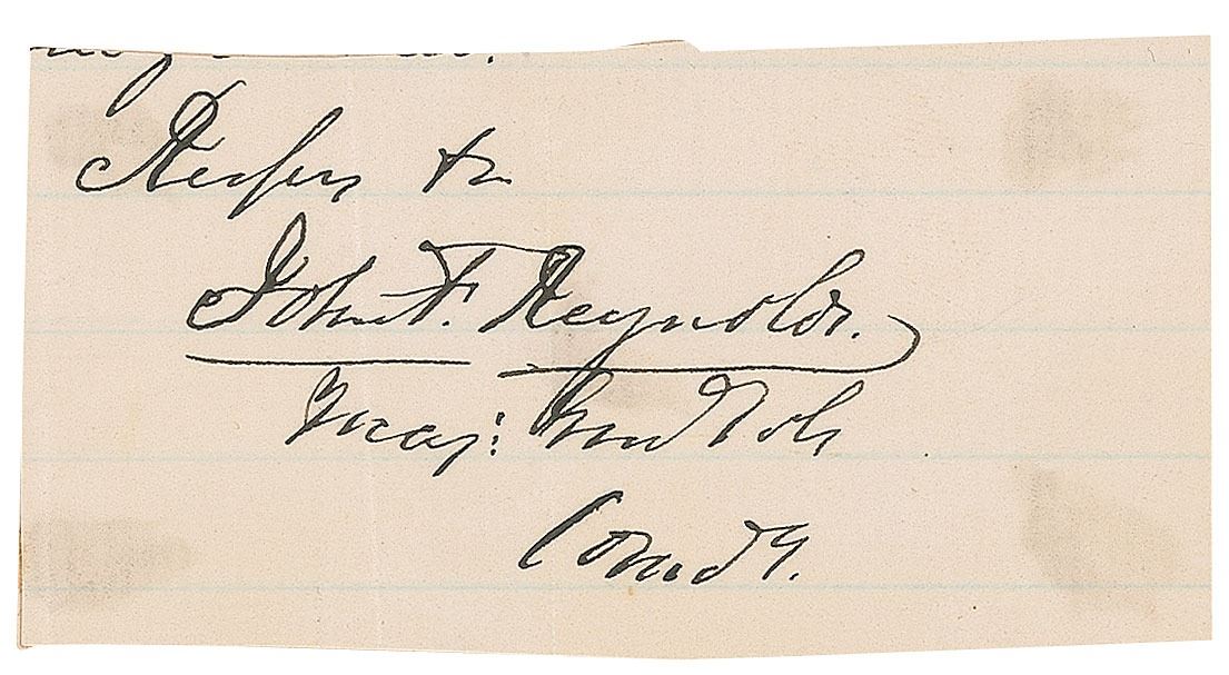 Highly respected senior commander of the Union Army (1820–1863) who played a key role in committing the Army of the Potomac to the Battle of Gettysburg, where he was killed at the very start of the battle. Ink signature, “Reply to John F. Reynolds, Maj: Genl. Vols, Comdg” on an off-white 3 x 1.5 lightly-lined slip affixed to a slightly larger sheet. In fine condition, with mounting remnants on the reverse lightly showing through.