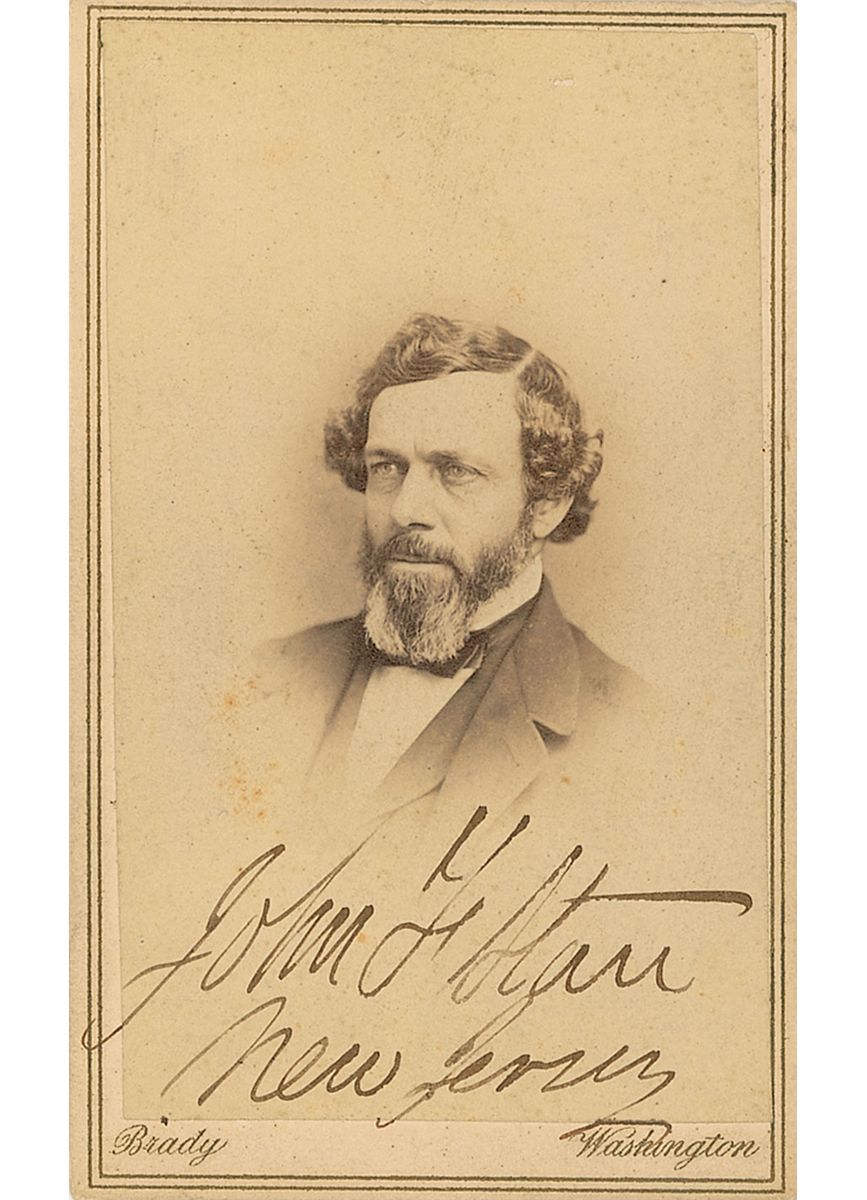New Jersey congressman (1818–1904) who served in the House of Representatives and one of the founders of the Camden Iron Works. Original 2.25 x 4 carte-de-visite photo by Brady of Washington, D. C., signed below the image in black ink, “John F. Starr, New Jersey.” In fine condition.
