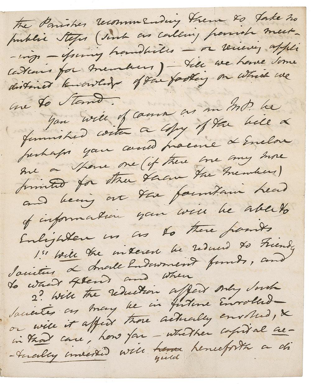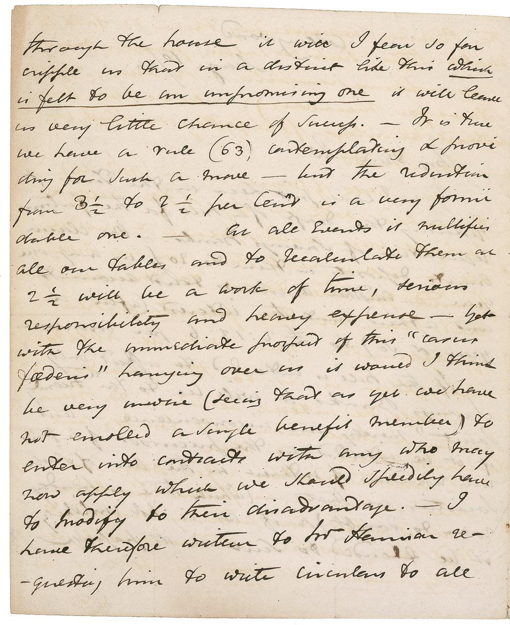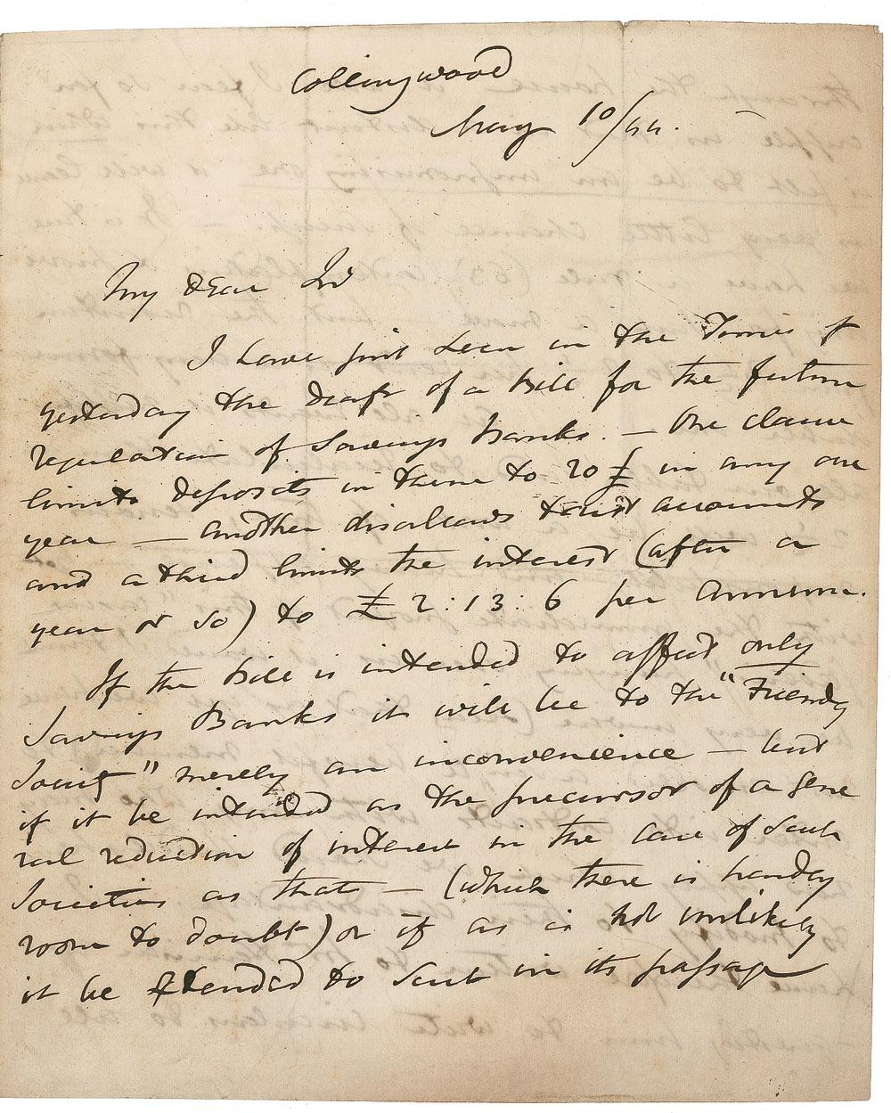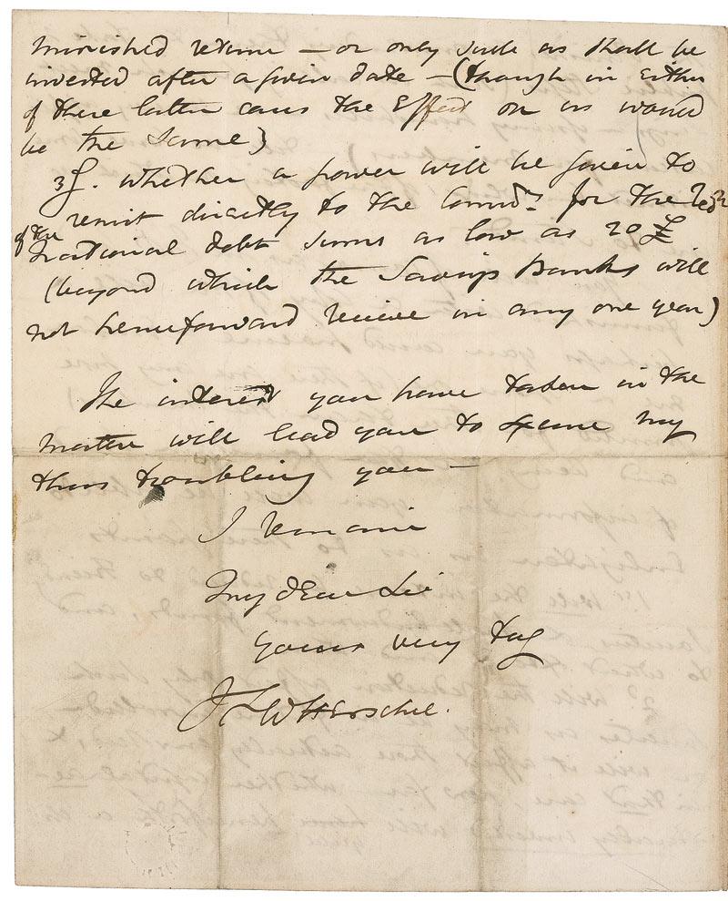 British mathematician, astronomer, and inventor (1792–1871) known for his discoveries related to the moons of Saturn and Uranus and for his pioneering work in early photographic processes, including coining the word ‘photography’ itself. ALS signed “J. F. W. Herschel,” four pages on two adjoining sheets, 7.5 x 9, May 10, 1844. Letter to an unidentified gentleman in Parliament. In part: “I have just seen in the Times of yesterday the Draft of a bill for the future regulations of Savings Banks. One claim limits deposits in them to 20£ in any one year. Another disallows trust accounts and a third limits the interest (after a year or so) to £ 2:13:6 per annum. If the bill is intended to affect only Savings Banks it will be to the ‚Friends Society’ merely an inconvenience–but if it be intended as the precursor of a general reduction of interest in the case of such Societies as that […] it will I fear so far cripple us that in a district like this which is felt to be an unpromising one it will leave us very little chance of success […] the reduction from 3_ to 2_ per Cent is a very formidable one.–At all events it nullifies all our tables and to recalculate them at 2_ will be a work of time, serious responsibility and heavy expense–yet with the immediate prospect of this‚ Casus Foederis’ hanging over us it would I think be very unwise […] to enter into contracts with any who may now apply which we should speedily have to modify to their disadvantage…I have therefore written to Mr. Hennisar requesting him to write circulars to all the Parishes recommending them to take no public steps…till we have some distinct knowledge of the tooting on which we are to stand.” In very good condition, with intersecting mailing folds, one through a single letter of signature, and scattered soiling and toning.