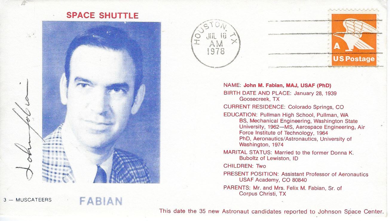John Fabian signed 1978 Space Shuttle First Day Cover. Commemorates the date 35 new Astronaut candidates reported to Johnson Space Center. 3x5 inches