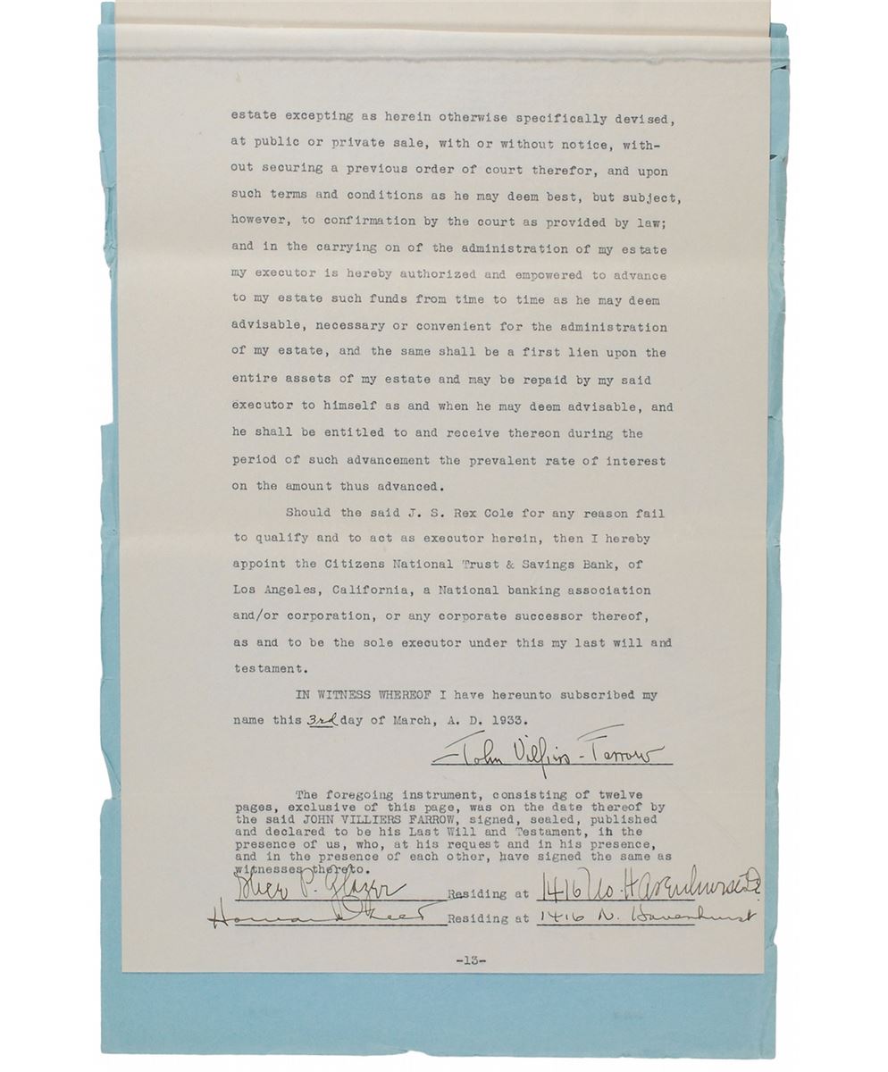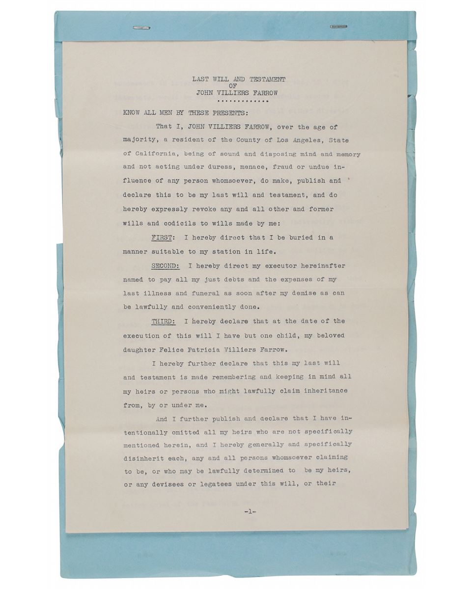 Director, producer, and screenwriter (1904–1963) who won an Academy Award for Best Writing for the 1956 film Around the World in Eighty Days. DS, signed “John Villiers Farrow,” thirteen pages, 8.5 x 12.5, March 3, 1933. Farrow’s last will and testament. In part: “I hereby bequeath to my daughter Felice Patricia Villiers Farrow, of Los Angeles, California, should she survive me, all my personal effects, such as clothing, jewelry and bric-a-brac.” Signed at the conclusion in fountain pen by Farrow and countersigned by two witnesses. Contained within its original paper folder. In fine condition, with heavy storage folds and expected document wear.