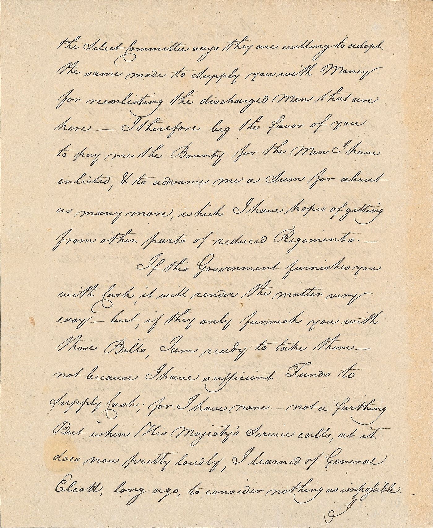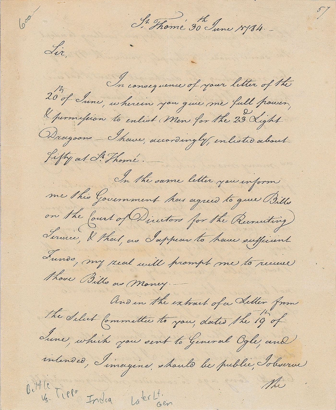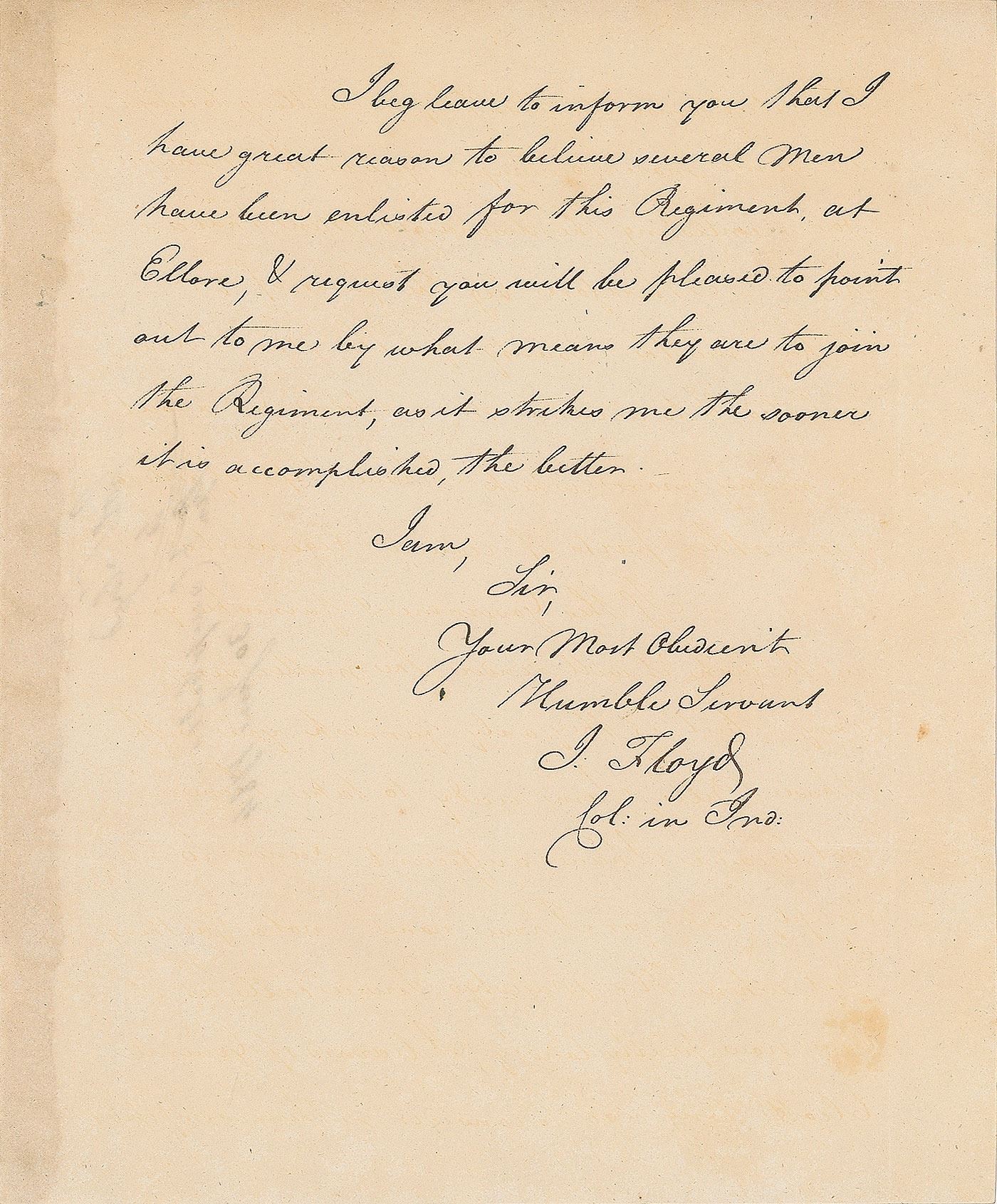 British cavalry officer (1748–1818) who commanded troops in the Third Anglo-Mysore War. ALS signed “J. Floyd, Col: in Ind:,” three pages on two adjoining sheets, 7.25 x 9, June 30, 1784. Letter to a gentleman, in part: "In consequence of your letter of the 20th of June, wherein you gave me full power, & permission to enlist Men for the 23d Light Dragoons—I have, accordingly, enlisted about Fifty at St. Thome. In the same letter you inform me this Government has agreed to give Bills on the Court of Directors for the Recruiting Service, & that, as I appear to have sufficient Funds, my zeal will prompt me to receive those Bills as Money." In very good to fine condition, with some light stains, and old mounting remnants along the hinge.
