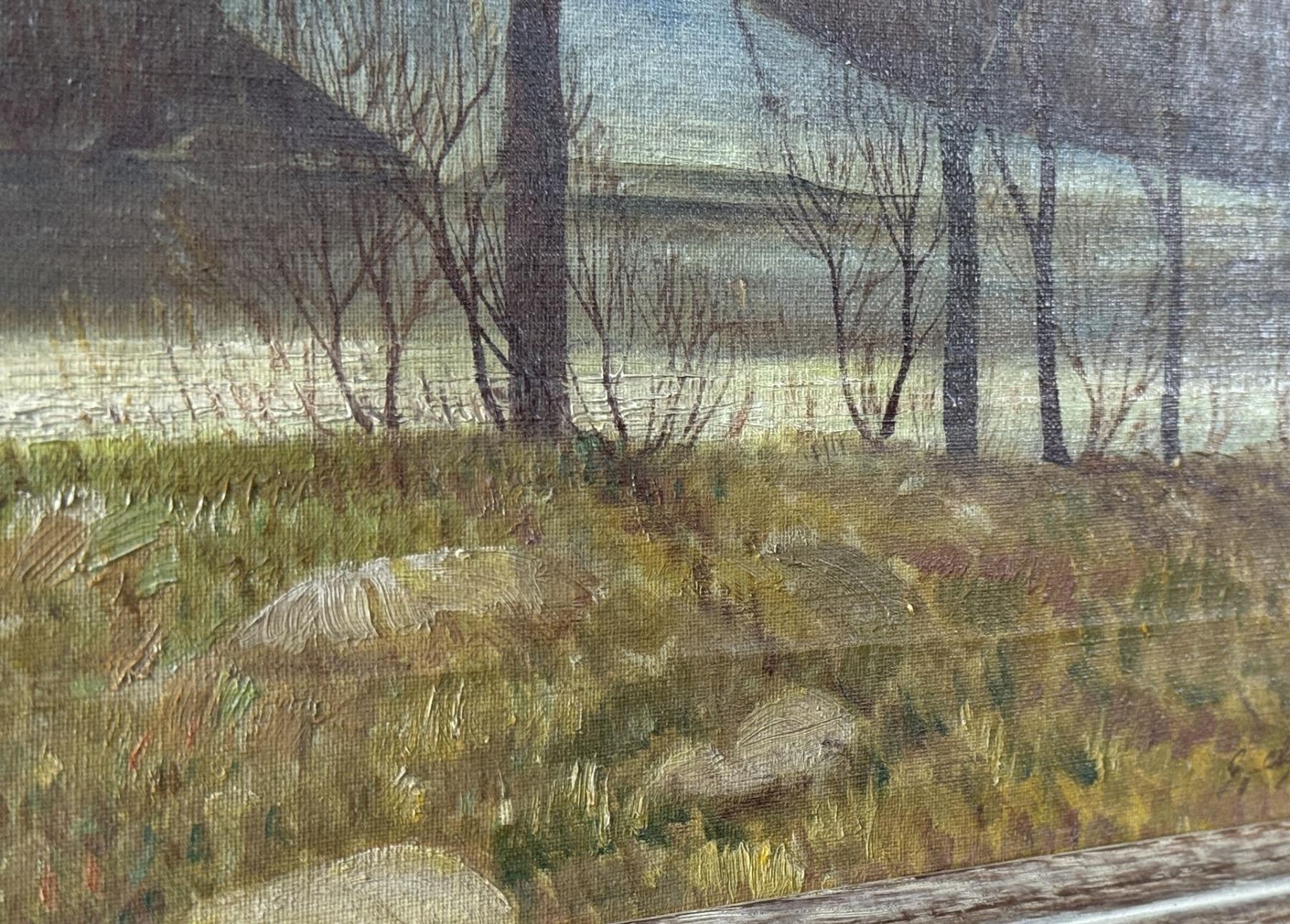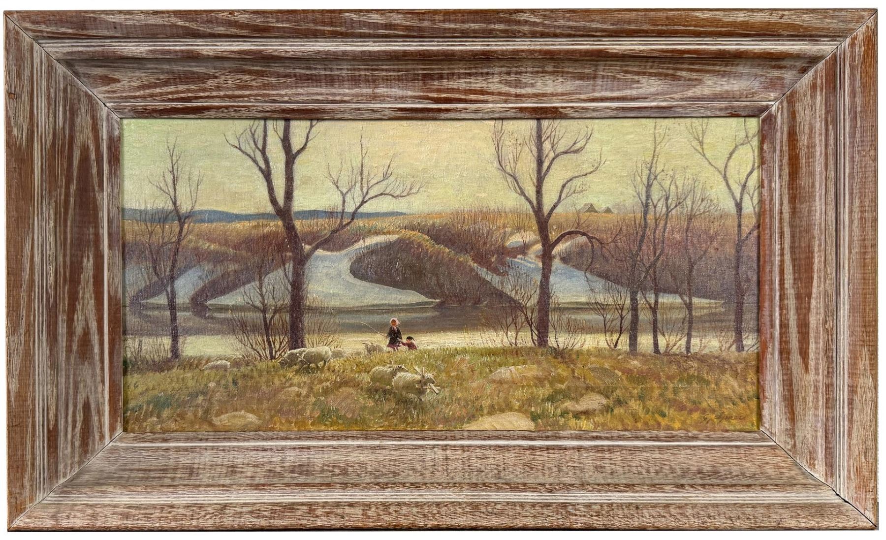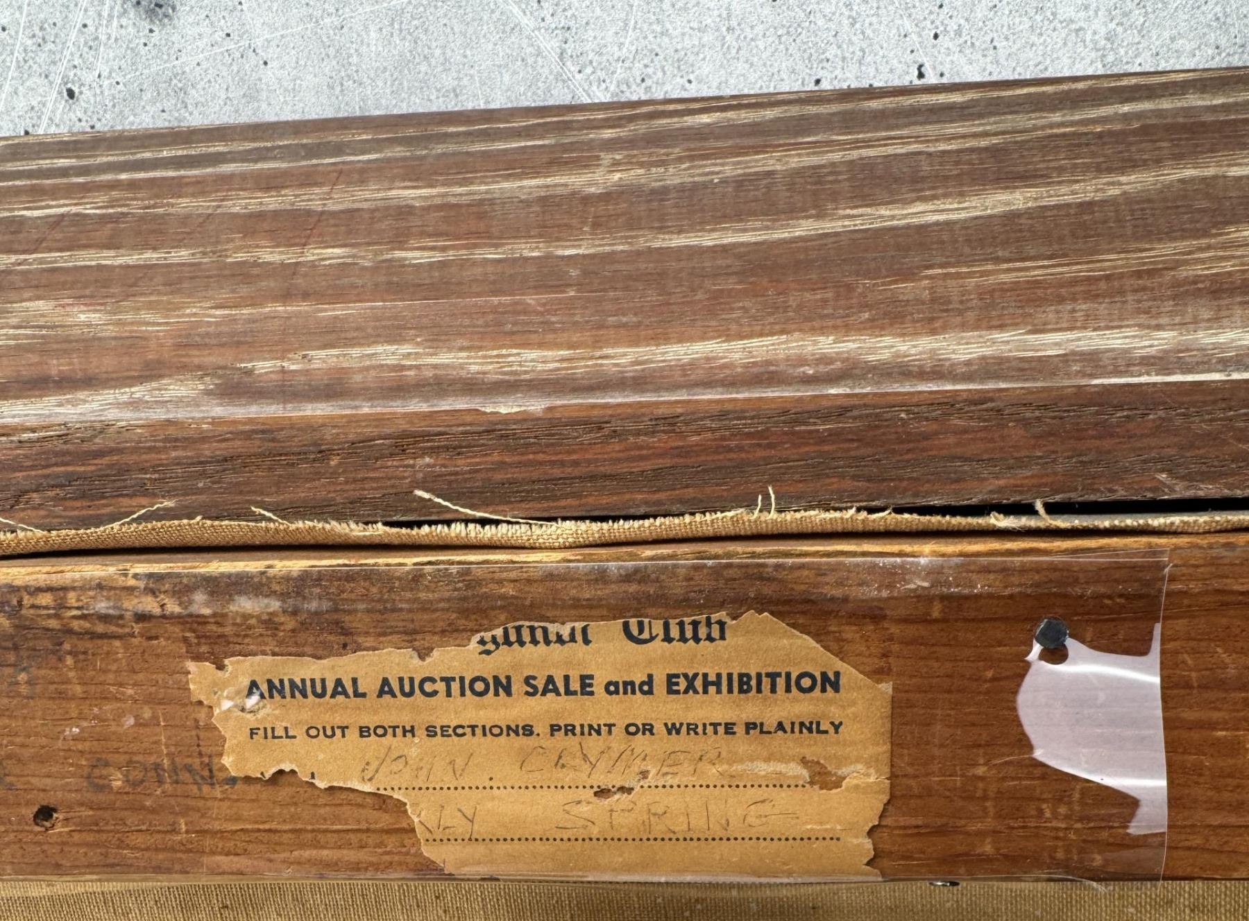 Title is Early Spring. Originally Exhibited and Sold at the Salmagundi Club Annual Auction. 10" by 20" unframed. 14 3/4" by 24 3/4" framed. Has a stretcher bar line. John Ford Clymer (1907 - 1989) was active/lived in Wyoming, Ontario / Canada. John Clymer is known for Genre-west, wildlife, illustrations. A student at the Howard Pyle School in Wilmington, Delaware, John Clymer was strongly influenced by N.C. Wyeth in illustration and became a noted painter of animals and western history. His first illustrations were for Canadian publications, and then he illustrated for pulp magazines and novels, which led to assignments with American magazines and advertising companies. He did a series of historic paintings about the United States Marine Corps during World War II. His illustration career continued for over forty years and included work for Field and Stream and Saturday Evening Post for which he did about ninety covers. Also, he illustrated the book, The Yearling. Affiliations included the National Academy of Western Art*, Salmagundi Club* and the Society of Animal Artists*, and the Cowboy Artists of America*. In the CAA annual exhibitions, he earned an Oil Painting Award, Gold, 1970, 1972, 1975 and Silver, 1969, 1976, 1981; Drawing Award, Gold, 1974, 1976, 1977; and the Kieckhefer Award: Best of Show, 1975 and 1979. In 1979, he also received a Special Award of Merit. John Clymer was born in Ellensburg, Washington and had an early desire to live in wilderness mountain areas and pursue a career in forestry, something his parents did not understand. He decided that if he could paint pictures, he could live anywhere he wanted, so at age 13, he enrolled in a correspondence course and then sold two drawings to Colt Firearms. After high school graduation, he attended the Vancouver School of Fine Art and the Ontario College of Art in Port Hope, Canada. Living in Canada, he did magazine illustration but left in 1930 to attend the Old Howard Pyle School in Wilmington, Delaware. There he worked with N.C. Wyeth and then returned to Canada and was elected an Associate of the Royal Canadian Academy of Art. He also studied with Fred Varley and J.W. Beaty and traveled extensively in Canada, Alaska and the Yukon. In 1936, Clymer moved to Westport, Connecticut and studied with Harvey Dunn in New York City as well as at the Grand Central School of Art. He later painted with Tom Lovell and joined the Marines with him during World War II. In 1964, he began fine art painting full time, and achieved much recognition and fame as a chronicler of the Northwestern Indians of whom he did many sketches and took photographs before doing the final work. With his historian, he traveled the Northwest to research a history filled with noted persons such as the Nez Perce Indians, Chief Joseph, Sacajawea, Lewis and Clark, Indians, Fur Traders and Trappers.