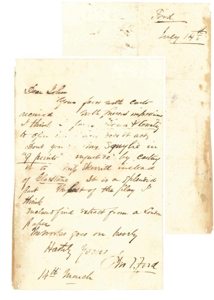 John Ford autograph letter signed, dated 14 March 1860, from Baltimore, where he was managing the Holiday Street Theater. Here, Ford instructs John Wright, later stage manager at Ford's Theatre, to produce a new play by Tom Taylor, the playwright who also wrote ''Our American Cousin.'' Letter, measuring 4.5'' x 7'', has some mounting traces on verso and light browning from glue remnants along left margin. Paper is abraded through the first paragraph of letter, causing partial ink loss and a few small holes. Overall, very good condition.