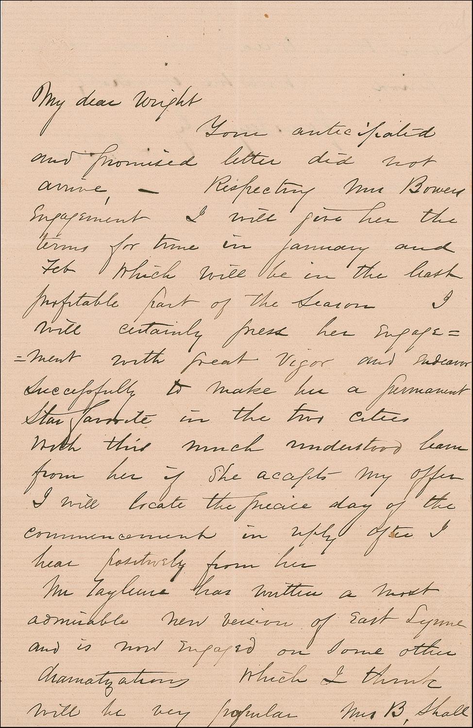 Rare ALS signed “J. T. Ford,” one page both sides, 5.25 x 8.25, no date. Ford writes Mr. Wright to discuss theater business. In full: “Your anticipated and promised letter did not arrive. Respecting Mrs. Bowers’ engagement, I will give her the terms for the time in January and Feb. which will be in the least profitable part of the Season. I will certain press her engagement with great vigor and endeavor successfully to make her a permanent Star favorite in two cities. With this much understood leave from her if she accepts my offer. I will locate the precise day of the commencement in reply after I hear positively from her. Mr. Tayleune has written a most admirable new version of East Lyme and is now engaged on some other dramatizations which I think will be popular. Mrs. B have them to read at an early period. Write me immediately.” In fine condition, with intersecting folds and slight separation of an adjoining page and a paper clip impression at the top margin.