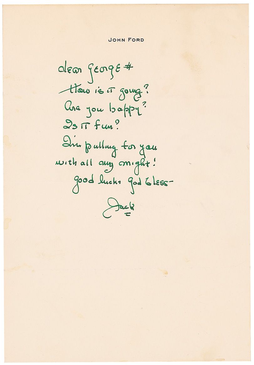 ALS signed “Jack,” one page, 7 x 10.25, personal letterhead, no date. Letter to George Cukor. In full: “How is it going? Are you happy? Is it fun? I’m pulling for you with all my might! Good luck & God bless.” Scattered toning and creasing and a paperclip impression along top edge, otherwise fine condition. An intimate and cordial message between two giants of American cinema.
