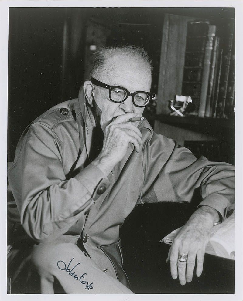 Glossy 8 x 10 photo of Ford smoking a cigar, signed in black felt tip. In fine condition, with mild scattered surface bends and creases.