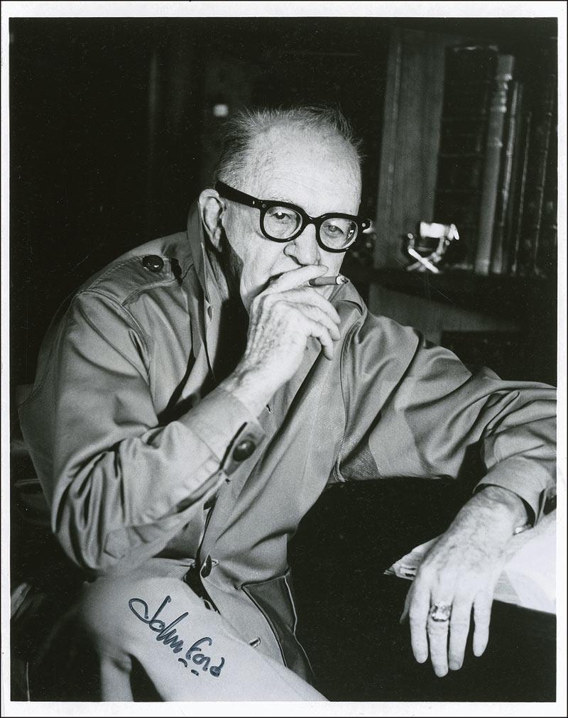 Highly respected, multiple-Oscar winning American film director (1894–1973) who helmed such classics as Stagecoach, The Grapes of Wrath, and The Searchers. Glossy 8 x 10 photo of Ford enjoying a cigar, signed in black felt tip. Some scattered light surface marks and impressions, otherwise fine condition.