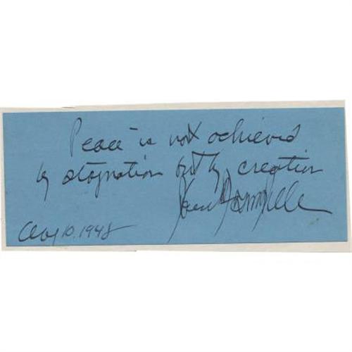 <B>John Foster Dulles Autograph Quote Signed,</B></I> on blue card stock, 5.5" x 2.25". In full: "<I>Peace is not achieved by stagnation but by creation John Foster Dulles Aug 10. 1948</B></I>". Mounted, otherwise very good to near fine.<BR><BR><b>Shipping:</b> Flat Material, Small (<a target="_blank" href="http://www.heritageauctions.com/common/shipping.php">view shipping information</a>)
