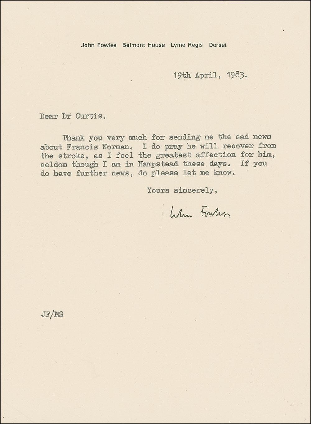 English novelist (1926–2005) considered one of the 50 greatest writers since 1945. TLS, one page, 6 x 8, personal letterhead, April 19, 1983. Fowles contacts a Dr. Curtis about a mutual friend’s illness. In full: “Thank you very much for sending me the sad news about Francis Norman. I do pray he will recover from the stroke, as I feel the greatest affection for him, seldom though I am in Hampstead these days. If you do have further news, do please let me know.” In fine condition, with a couple of light creases and wrinkles, and a mailing fold passing through the signature.