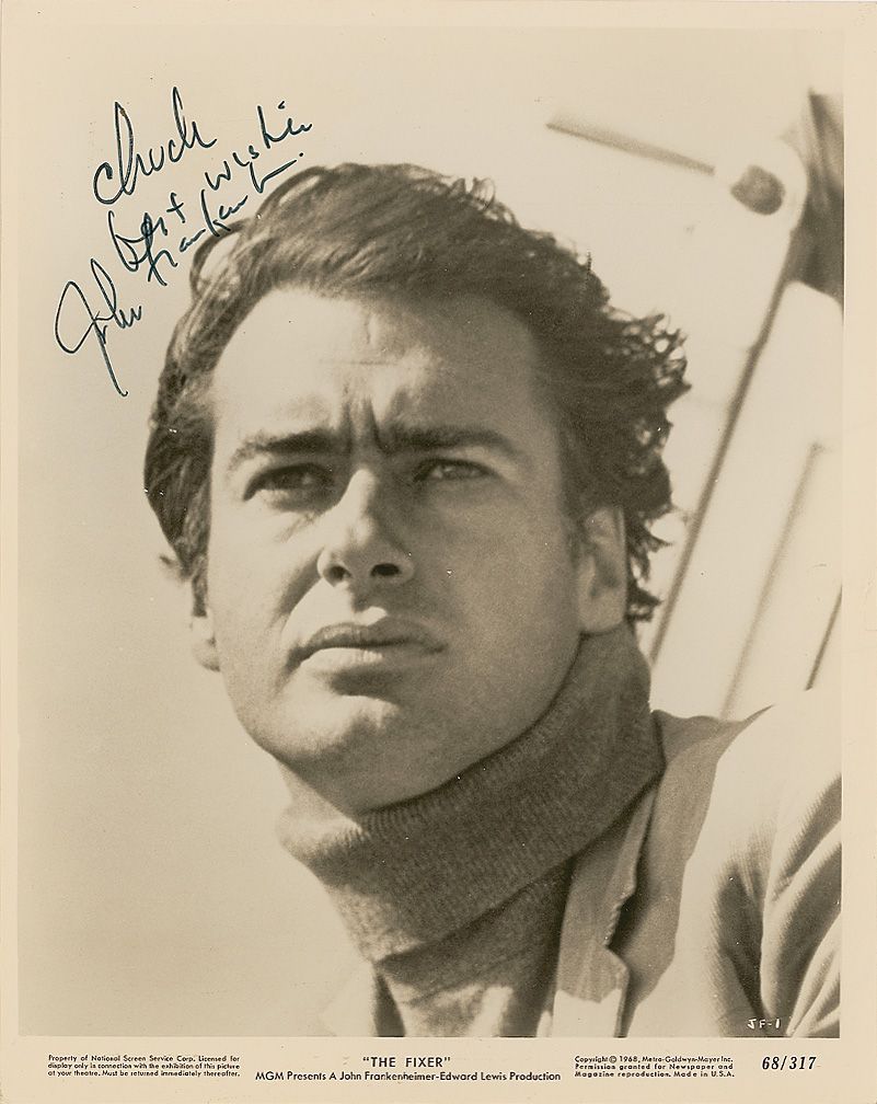 Glossy 8 x 10 MGM promotional photo for The Fixer, signed and inscribed in black felt tip “Chuck, best wishes, John Frankenheimer.” Scattered creases and impressions, and a ding to the right border, otherwise fine condition.