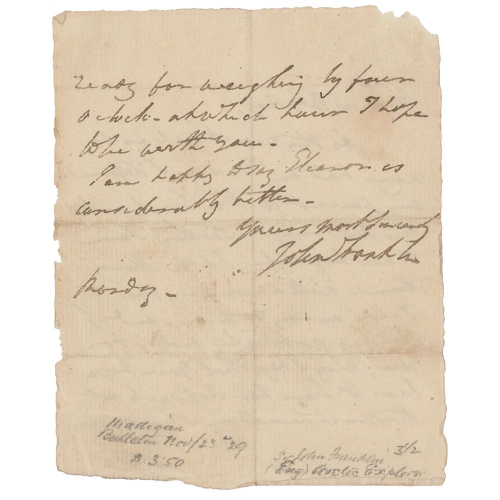 Rare ALS, one page both sides, 4 x 5, no date. Handwritten letter, in part: "As the weather was so very bad on Friday, I deferred my jaunt to Woolwich until this morning, whither I am now bound, I hope Mary Anne will accompany me‰Û_and if she has got sailing orders from you, may I beg that you request her to have topsails at the masthead and her anchor ready for weighing by four o'clock, at which hour I hope to be with you. I am happy to say Eleanor is considerably better." In fine condition, with intersecting folds, and minor edge loss.