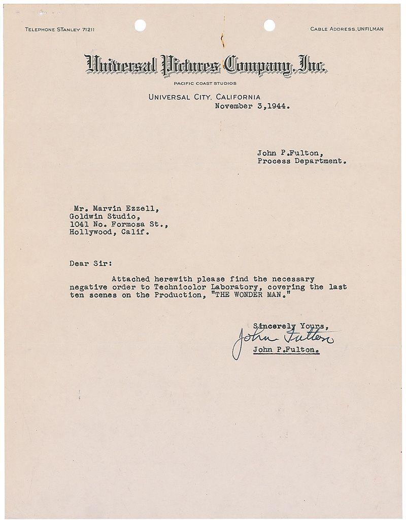 Special effects artist (1902–1965) remembered for his innovative trick photography techniques and winner of two Acadamy Award wins for Best Special Effects. His work included Universal’s horror films—Dracula, Frankenstein, The Mummy, and The Invisible Man, among others—and Hitchcock thrillers, notably Rear Window and Vertigo. TLS, one page, 8.5 x 11, Universal Pictures letterhead, November 3, 1944. Letter to Marvin Ezzell of Goldwin [sic] Studio. In full: “Attached herewith please find the necessary negative order to Technicolor Laboratory, covering the last ten scenes on the Production, ‘The Wonder Man.’” In fine condition, with staple holes in upper left corner, two punch holes to top, and a rusty paperclip impression to top. Fulton won his first Oscar for his work on The Wonder Man.