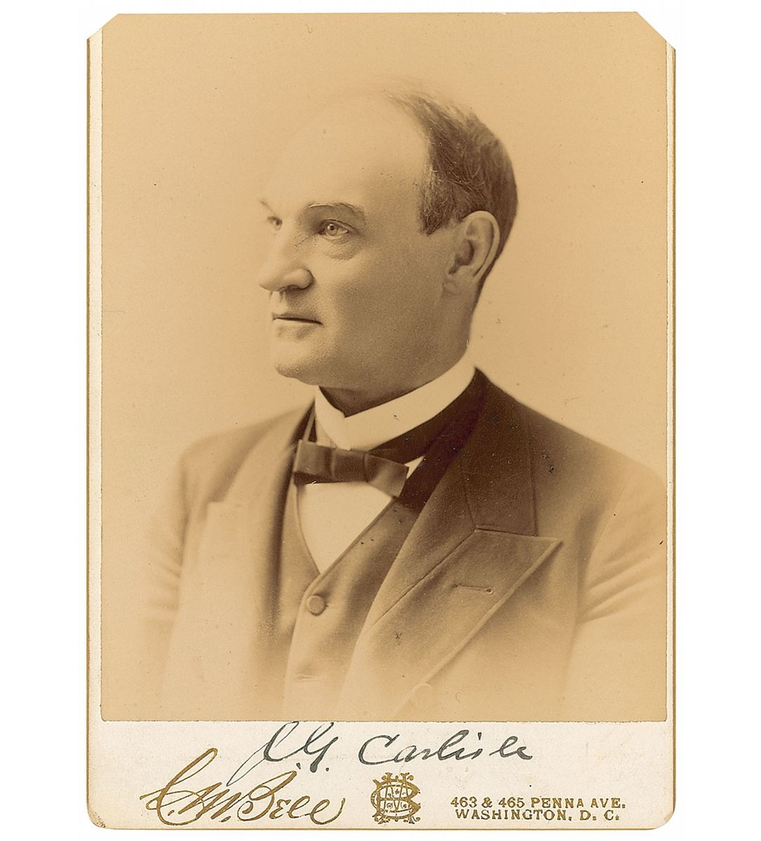 Politician from Kentucky (1834–1910) who served as Speaker of the House from 1883–1889 and Secretary of the Treasury from 1893–1897. Original 4 x 6.5 cabinet photo by C. M. Bell, signed in the lower border in black ink, “J. G. Carlisle.” Clipped top corner tips, a couple surface dings, and mounting remnants to reverse, otherwise fine condition.