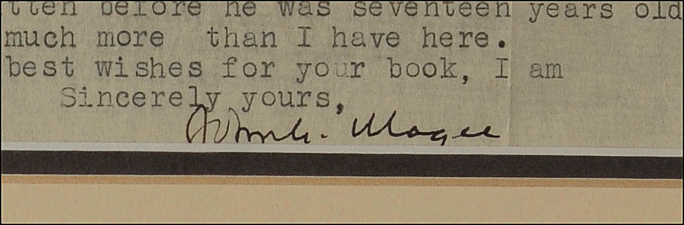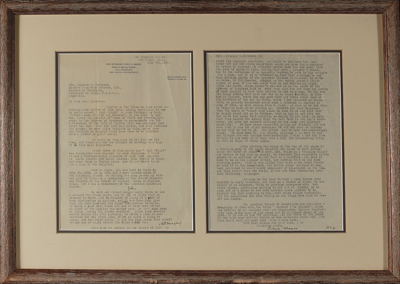 The elder Magee gives a three paragraph biography of his son and then relates the history of the poem. In part: “After getting his wings at the top of the class in a training camp of the Royal Canadian Air Force he was sent abroad about the first of July 1941…while on a training flight and before he had been in combat, he composed that exquisite little sonnet at an altitude of 30,000 feet in a Spitfire, and sent it home to us in his regular letter, not knowing that he had done anything great. When he was killed four days after Pearl Harbor we gave it to the newspapers, and within about ten days it had been published in about every newspaper of importance in the USA…While on practice maneuvers with two other planes, practicing getting in and out of clouds, as he came out of a cloud he ran into another plane piloted by an English boy just learning to fly, both being killed instantly.” He adds a lengthy handwritten postscript concerning his permission to also use the poem as part of a war memorial. Double-matted with both sides visible to an overall size of 24 x 17.5. Intersecting folds, light creasing and wrinkling, light toning, and show-through from his postscript on the reverse of the second page and a newsprint copy of the poem, otherwise fine condition.
