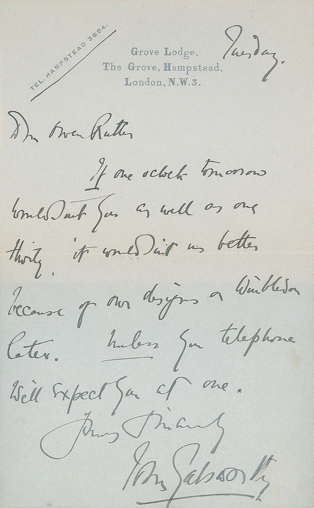 ALS, one page, 5 x 8, Grove Lodge letterhead, no date. Letter to historian and writer Owen Rutter. In part: “If one o’clock tomorrow would suit you…it would suit us better because of our designs on Wimbledon later.” Affixed to the first free end page of a 1932 hardcover first edition of Galsworthy’s Flowering Wilderness. In fine condition, with a trivial spot of soiling to the letter and a slightly cocked spine to the book.