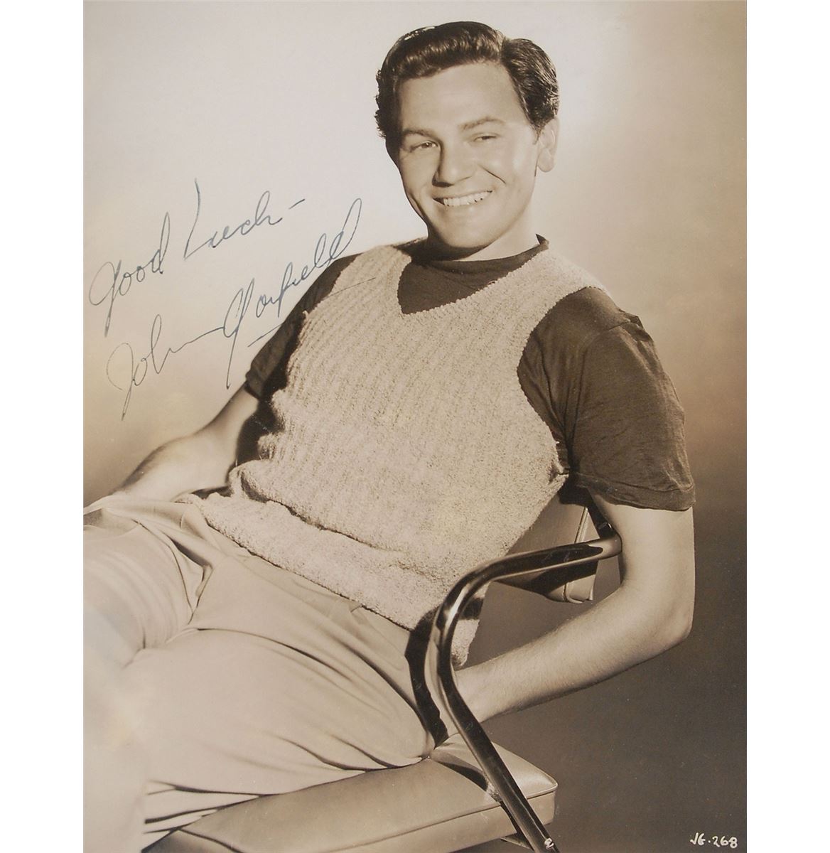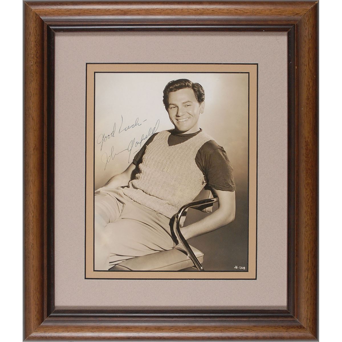 Oscar-nominated actor (1913–1952) who appeared in such classics as The Postman Always Rings Twice and Gentleman’s Agreement. Blacklisted in Hollywood for his liberal beliefs amid the second Red Scare, a 39-year-old Garfield died of heart failure just two months after returning to the stage in a revival of Golden Boy. Handsome vintage glossy 7 x 9 photo of a relaxed Garfield, signed in fountain pen, “Good luck—John Garfield.” Double-matted and framed to an overall size of 13.75 x 15.75. In fine condition, with a few slight toning marks from fingerprints. The James Collings Collection.