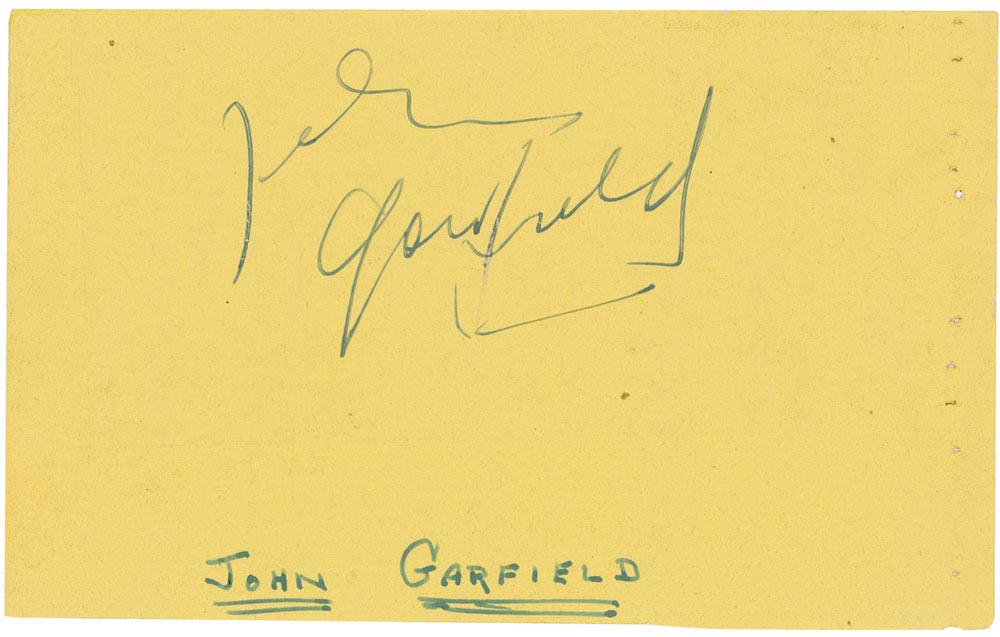 Vintage fountain pen signature, ”John Garfield,” on a yellow 6 x 3.75 album page with consignor notation along bottom edge. In fine condition, with slight scratching to the surface from pen.
