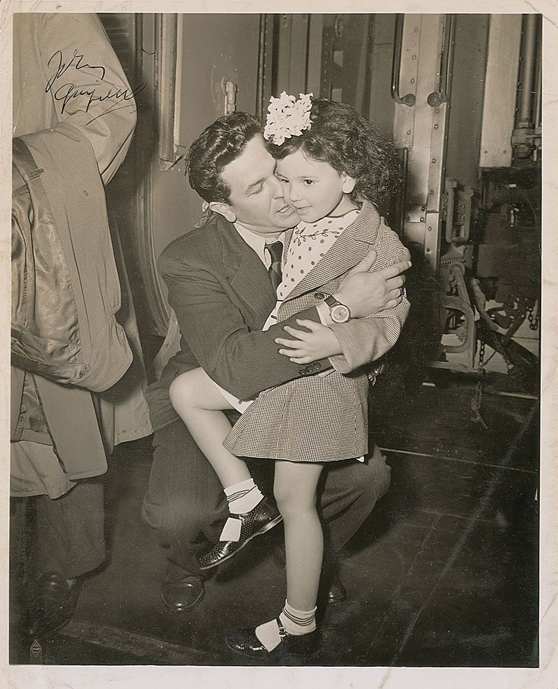 Vintage glossy 8 x 10 photo of Garfield hugging a young girl, signed in fountain pen. In very good condition, with scattered creases, some passing through signature.