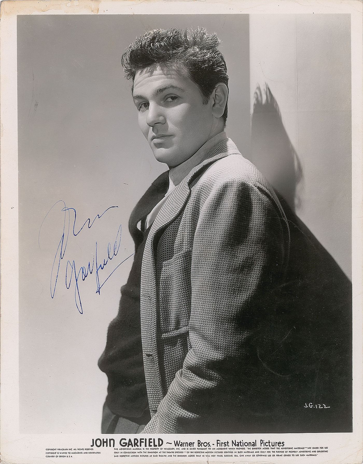 Oscar-nominated actor (1913-1952) who appeared in such classics as The Postman Always Rings Twice and Gentleman's Agreement. Blacklisted in Hollywood for his liberal beliefs amid the second Red Scare, a 39-year-old Garfield died of heart failure just two months after returning to the stage in a revival of Golden Boy. Vintage glossy 8 x 10.25 Warner Bros.–First National Pictures publicity photo of Garfield in a cool half-length pose, signed in fountain pen. In fine condition, with scattered light creasing and a stain in the top border.