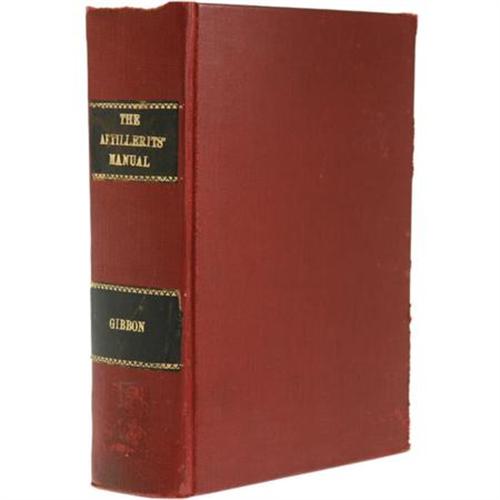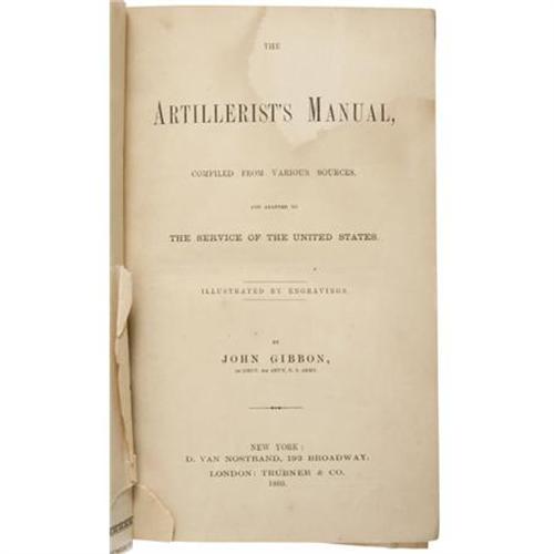<B>John Gibbon, <I>The Artillerist's Manual Compiled From Various Sources and Adapted to the Service of the United States,</B></I></B></I> (New York: D. Van Nostrand, 1860), 569 pages, 1 page adverts, with fold-out illustrations, 8vo (5.5 x 9), ex- library copy, loose spine, water stains, else fair. <BR><BR><b>Shipping:</b> Books & Catalogs (<a target="_blank" href="http://www.heritageauctions.com/common/shipping.php">view shipping information</a>)