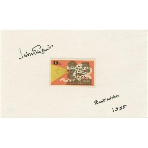 <B>John Gielgud Autograph.</B></I> A 3" x 5" card, with a 13-cent commemorative postage stamp affixed, signed by Sir John Gielgud in black ink. The Academy Award-winning actor's autograph extends across the upper right corner, accompanied by Gielgud's best wishes and dated 1995. In Excellent condition.<BR><BR><b>Shipping:</b> Flat Material, Small (<a target="_blank" href="http://www.heritageauctions.com/common/shipping.php">view shipping information</a>)