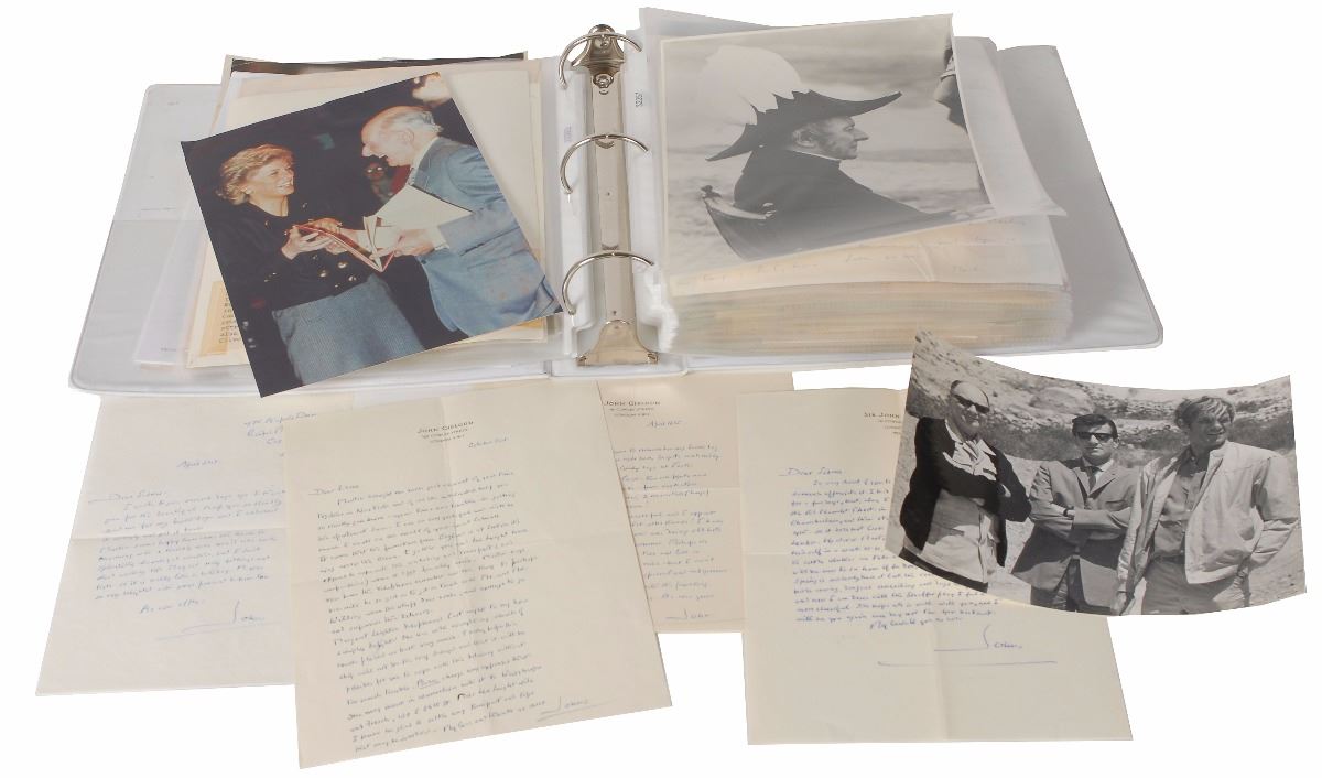 Wonderful collection of correspondence between legendary actor John Gielgud and his partner Martin Hensler with their friend, New York artist Sidnee Livingston, consisting of approximately 55 handwritten letters, the majority of which are penned by Hensler, with eight filled out and signed by Gielgud. One letter, dated January 20, 1982, in part: “We have just returned from spending Christmas and the New Year in South Africa, to find your monotype safely waiting for us. It’s lovely and you are an absolute dear to be so kind. Thank you…I rode an ostrich, was chased by an elephant and can even tell you how to sex a crocodile not that you would be remotely interested. They all eat a perfectly disgusting amount out there and I am rather fat but the friendliness of the natives was most marked and we could almost forget that we are getting on a bit really. All that beach life is so very physical somehow.” Also includes a few telegrams, a secretarial letter, and seven unsigned photos of Gielgud throughout his career. Housed in a modern three-ring binder. In overall fine condition. Accompanied by the original envelopes for the eight Gielgud letters, each addressed in his own hand.