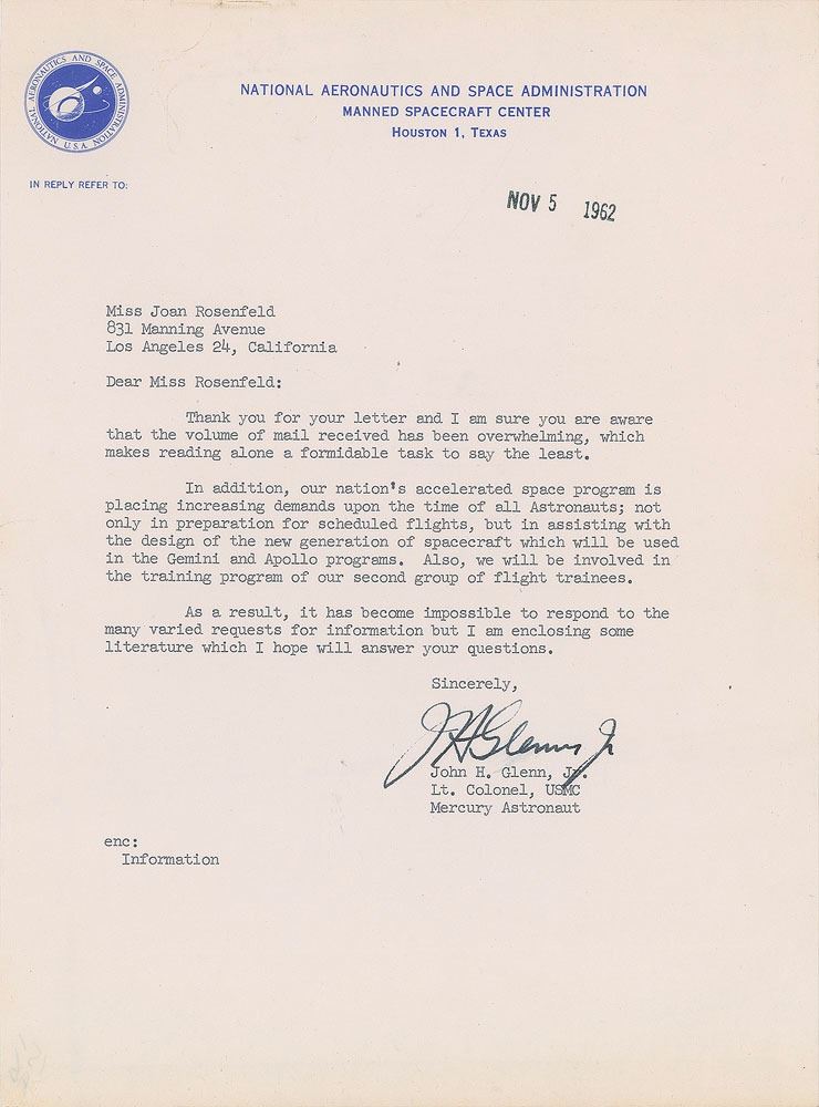 TLS signed “J. H. Glenn, Jr.,” one page, 7.75 x 10.5, NASA letterhead, stamp-dated November 5, 1962. Letter to Joan Rosenfeld, in full: "Thank you for your letter and I am sure you are aware that the volume of mail received has been overwhelming, which makes reading alone a formidable task to say the least. In addition, our nation's accelerated space program is placing increasing demands upon the time of all Astronauts; not only in preparation for scheduled flights, but in assisting with the design of the new generation of spacecraft which will be used in the Gemini and Apollo programs. Also, we will be involved in the training program of our second group of flight trainees. As a result, it has become impossible to respond to the many varied requests for information but I am enclosing some literature which I hope will answer your questions." In fine condition, with a small tear to left edge.