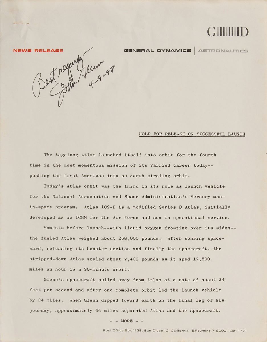 Collection of four items: an official color 8 x 10 NASA lithograph of Glenn in formal attire, signed in black felt tip, “Best regards—John Glenn”; an original two-page General Dynamics press release for an Atlas launch, signed in black felt tip, “Best regards—John Glenn, 4-9-98”; a souvenir typescript featuring a quote from the Friendship 7 launch, signed in black felt tip, “Best regards—John Glenn,” also bearing an affixed sleeve encasing a signed FDC commemorating Glenn’s flight. In overall very good to fine condition, with haloing to the signature on the typescript. From the collection of aerospace memorabilia specialist Ken Havekotte.