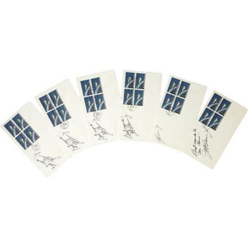 <B>John Glenn - Lot of Six Signed Project Mercury First Day Covers</B></I> postmarked February 20, 1962, at Cape Canaveral, Florida celebrating the release of Scott #1193. John Glenn was one of the original "Mercury Seven" astronauts and he was the first American to orbit the earth, doing so in the <I>Friendship 7</B></I> on the very date these stamps were issued. All six of these covers feature blocks of four stamps, none are cacheted, nor are they addressed. All are signed with the early form of his signature "<I>J H Glenn, Jr.</B></I>" and one is inscribed "<I>Best Regards to Mr. sic Coons-</B></I>". Very fine condition. <I>From the estate of Dr. D. Owen Coons, Chief of NASA's Manned Spacecraft Center Medical Office.</B></I><BR><BR><b>Shipping:</b> Flat Material, Small (<a target="_blank" href="http://www.heritageauctions.com/common/shipping.php">view shipping information</a>)