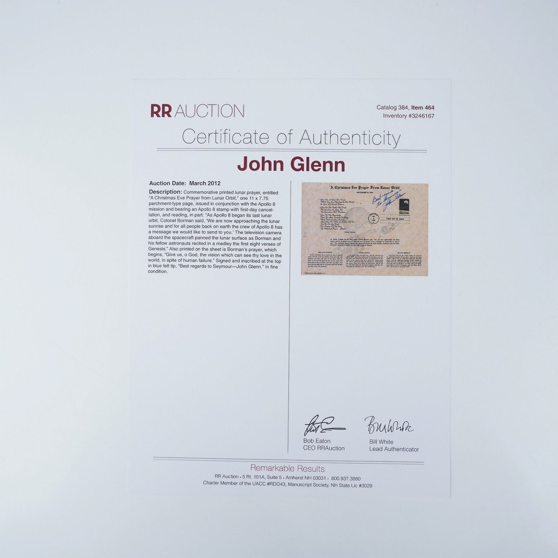 A commemorative print titled A Christmas Eve Prayer from Lunar Orbit, issued to honor the historic Apollo 8 mission. This print features the prayer delivered by astronaut Frank Borman on December 24, 1968, as the crew orbited the Moon. The piece is autographed by John Glenn, one of America's most celebrated astronauts, in blue felt tip with a personal inscription. It also bears an Apollo 8 commemorative stamp with a First Day of Issue cancellation from May 5, 1969, Houston, Texas. John Glenn (1921-2016) was a pioneering American astronaut, military pilot, and statesman. In 1962, he became the first American to orbit the Earth aboard Friendship 7 during NASA's Mercury program. Glenn later returned to space in 1998 aboard the Space Shuttle Discovery, becoming the oldest person to fly in space at age 77. His contributions to space exploration and public service remain unparalleled. The Christmas Eve Prayer was part of a live broadcast from Apollo 8 as it orbited the Moon. Astronaut Frank Borman delivered a prayer for peace and goodwill, reading from the Book of Genesis. This poignant moment united millions worldwide and reflected the mission's historic and spiritual significance during the Christmas season. This lot includes a RR Auction Certificate of Authenticity, verifying the signature's authenticity.