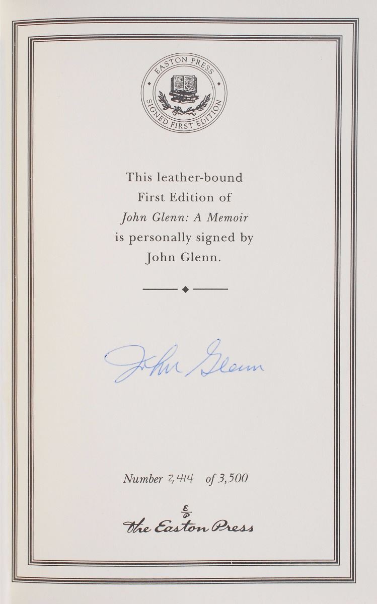 Signed book: John Glenn: A Memoir. Limited first edition, numbered 2414/3500. Norwalk, CT: Easton Press, 1999. Leather-bound hardcover, 6.25 x 9.5, 422 pages. Signed on the colophon in blue ballpoint by Glenn. In fine condition.