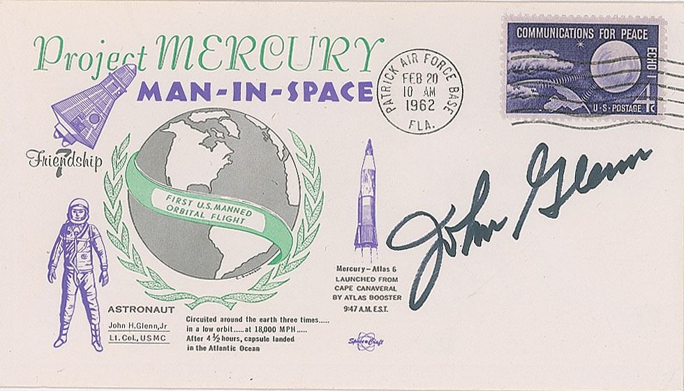 Mercury-Atlas 6 launch day cover with a cachet honoring the Project Mercury Man-in-Space program, postmarked at Patrick Air Force Base on February 20, 1962, signed in black felt tip, "John Glenn." In very fine condition.