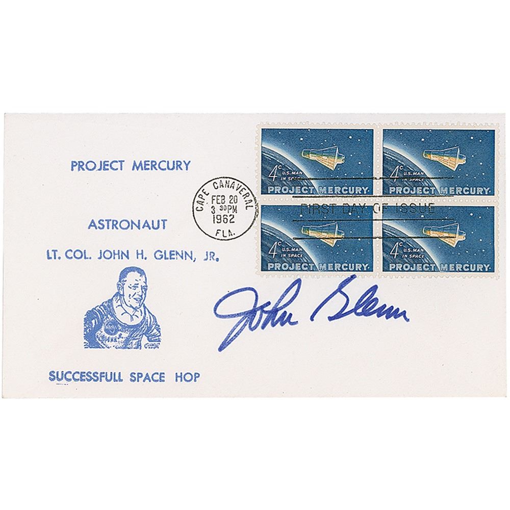 Commemorative cover with a stamped cachet honoring Project Mercury, John Glenn, and his ‰ÛÏSuccessful Space Hop,‰Û postmarked from Cape Canaveral on February 20, 1962, the date of the Mercury-Atlas 6 mission, signed in blue felt tip. In very fine condition. Accompanied by a full letter of authenticity from Zarelli Space Authentication.