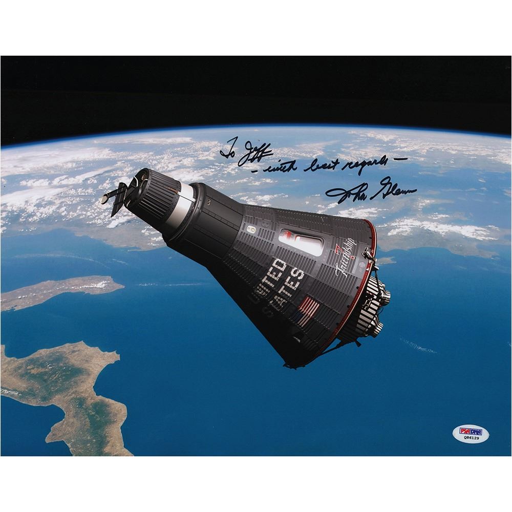 Color satin-finish 14 x 11 photo of the Friendship 7 capsule floating high above the Earth, signed and inscribed in black felt tip, "To Jeff—with bet regards—John Glenn.” In fine condition, with a PSA/DNA label affixed to the lower right corner. Accompanied by a certificate of authenticity from PSA/DNA.