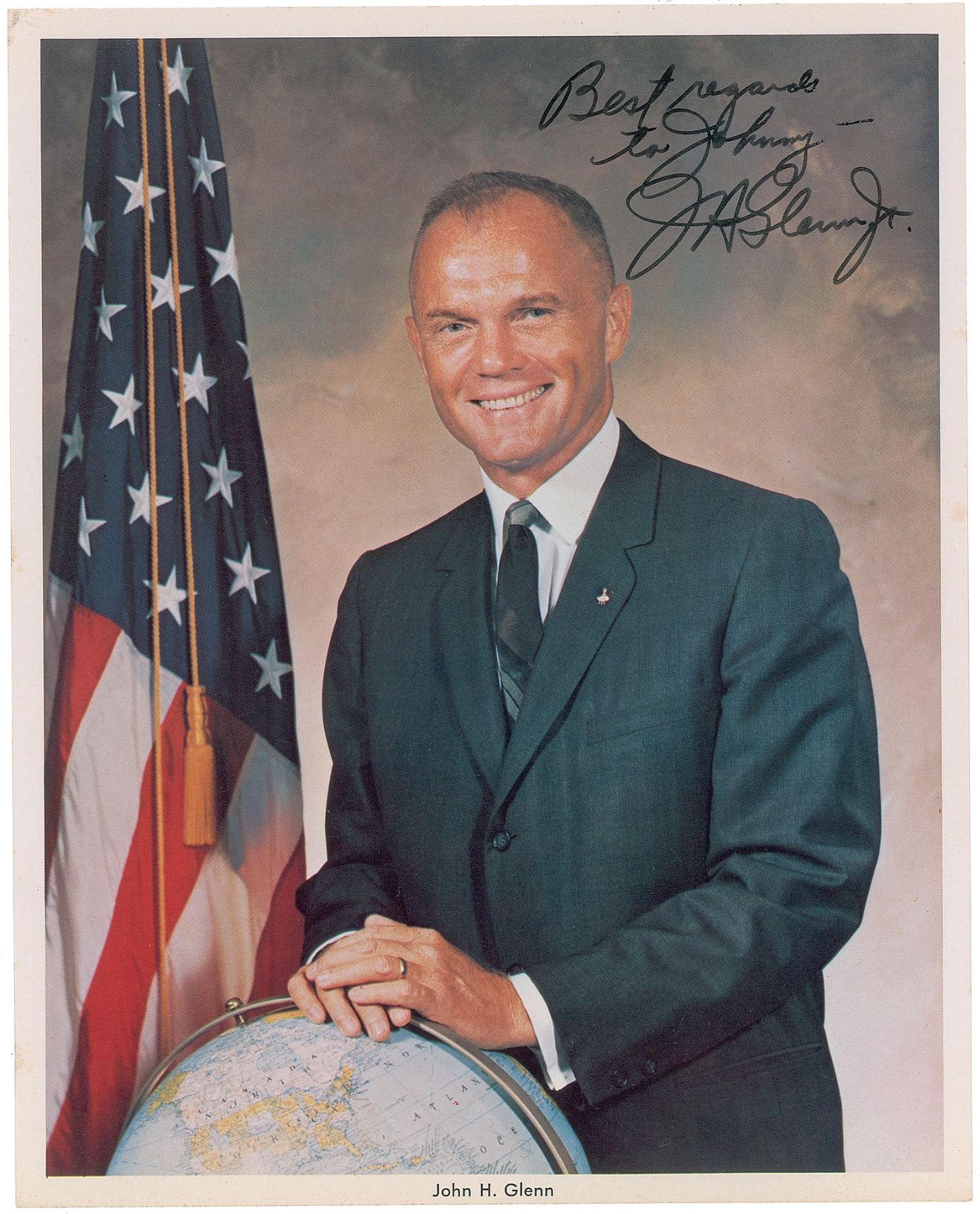 Official color 8 x 10 NASA lithograph of Glenn posing with a globe and American flag, signed and inscribed in black felt tip, "Best regards to Johnny—J. H. Glenn, Jr.” In fine condition.