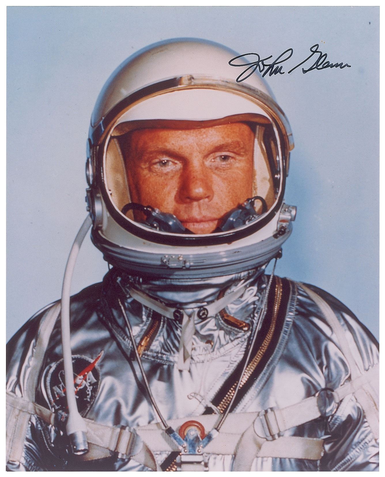 Color semi-glossy 8 x 10 head-and-shoulders photo of John Glenn wearing his Mercury space suit, signed in black felt tip. In very fine condition.