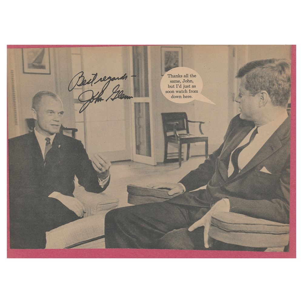 Humorous 10.75 x 7.75 newspaper photo of Glenn sitting with President John F. Kennedy (with a cartoon speech bubble saying, "Thanks all the same, John, but I'd just as soon watch from down here"), signed in black felt tip, "Best wishes, John Glenn." Affixed to a slightly larger sheet and in fine condition.