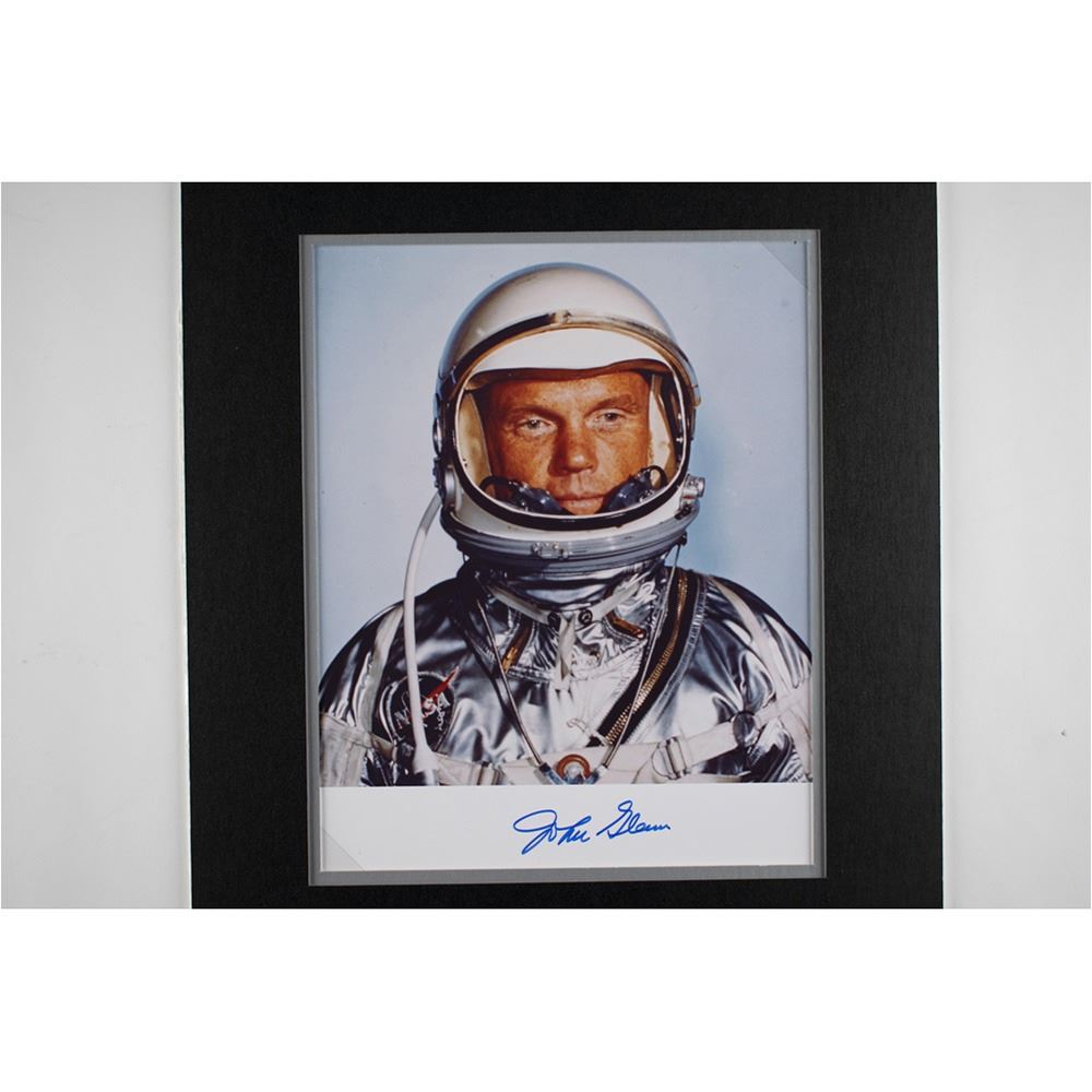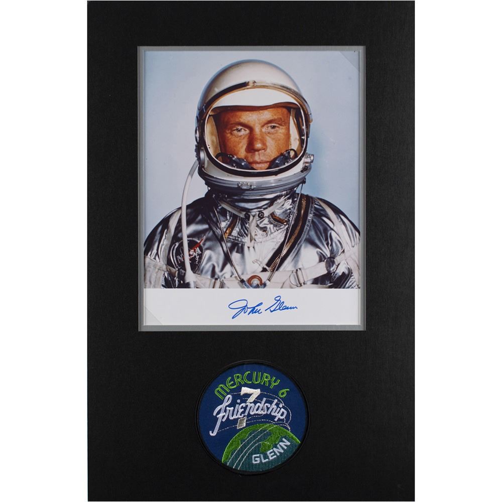 Color satin-finish 8 x 10 photo of Glenn in his silver Project Mercury suit, signed in the lower border in blue felt tip. Double-matted with an embroidered Friendship 7 patch to an overall size of 11.5 x 17.75. In fine to very fine condition.