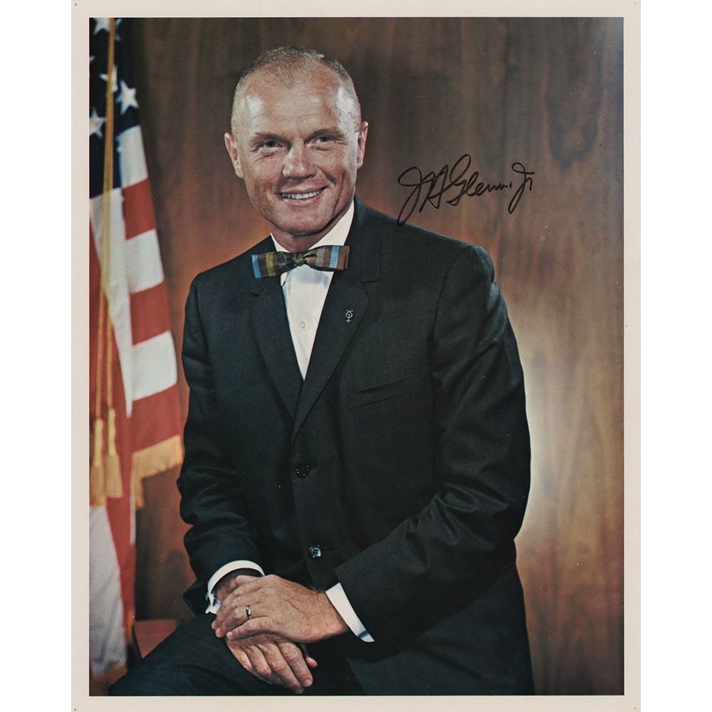 Official color 8 x 10 NASA lithograph of Glenn wearing a bow tie with a Mercury 7 pin on his lapel, signed in black felt tip, "J. H. Glenn, Jr." In fine condition, with a small stain near the right edge.