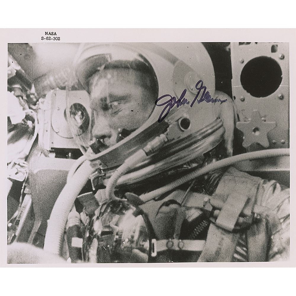 Official glossy 10 x 8 numbered NASA photo (S-62-302) of John Glenn in the Friendship 7 spacecraft during the Mercury-Atlas 6 mission, signed in black felt tip. In fine condition, with some marks to edges.