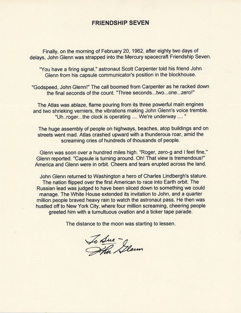 Souvenir typescript, one page, 8.5 x 11, signed and inscribed at the conclusion in black felt tip, "To Sue--John Glenn." An excerpt describing John Glenn's Friendship 7 flight, in part: "John Glenn returned to Washington a hero of Charles Lindbergh's stature. The nation flipped over the first American to race into Earth orbit. The Russian lead was judged to have been sliced down to something we could manage." In fine condition, with two horizontal mailing folds.