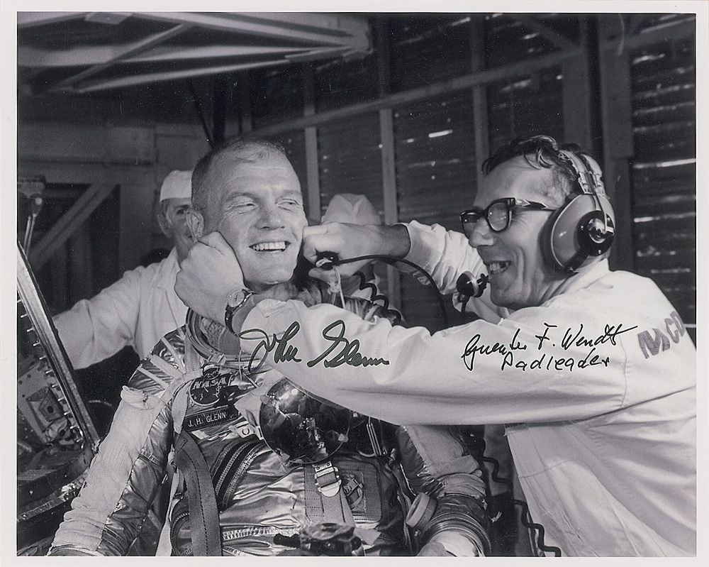 Satin-finish 10 x 8 photo of Wendt clowning around with Glenn before his flight, signed in black felt tip by both John Glenn and Guenter Wendt, adding “Padleader,” under his signature. In very fine condition.