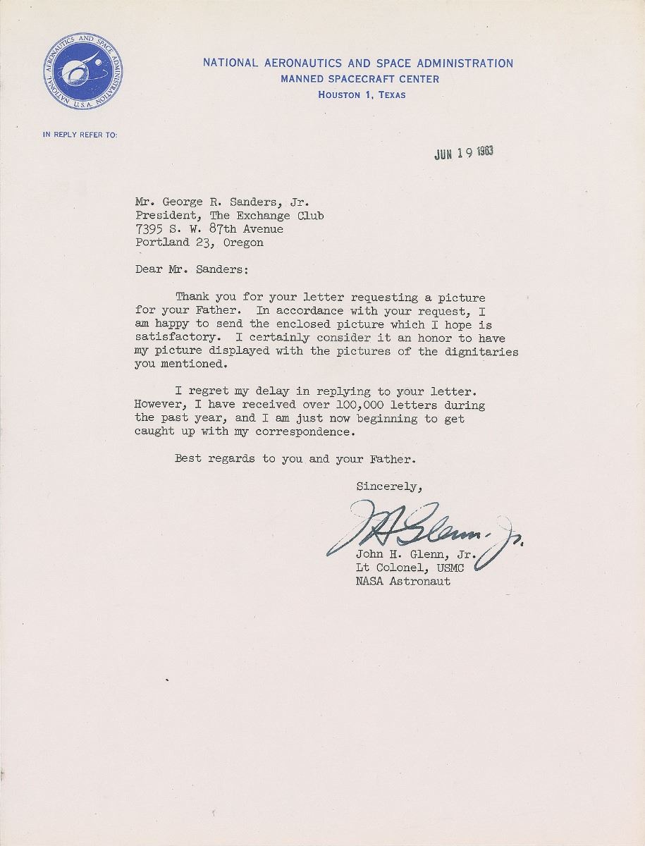 Two letters: a TLS signed “J. H. Glenn, Jr.,” NASA letterhead, June 19, 1963, in part: “I certainly consider it an honor to have my picture displayed with the pictures of the dignitaries you mentioned. I regret my delay in replying to your letter. However, I have received over 100,000 letters during the past year, and I am just now beginning to get caught up with my correspondence”; and a TLS signed “Scott Carpenter,” NASA letterhead, July 2, 1963, in part: “My sincere thanks for your generosity in sending the INCA Indian relics.” In overall fine condition.