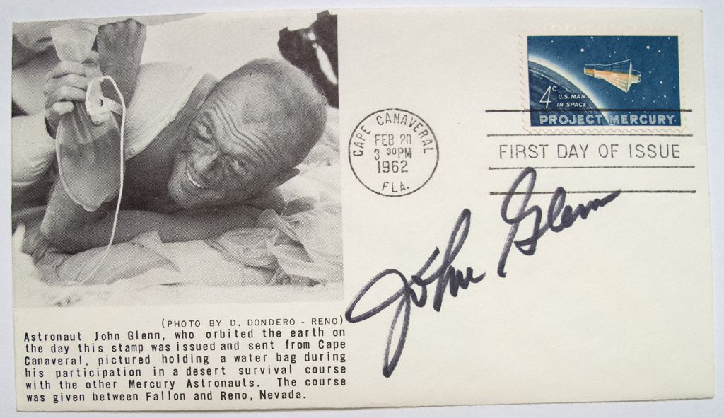 John Glenn autograph on First Day of Issue for Project Mercury stamp